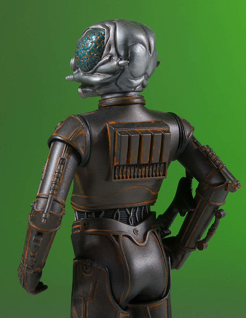 「4-LOM 1/8 比例全身雕像」完整再現了他在電影中的樣貌,彷彿蒼蠅頭的造型被精緻地刻劃出來,大大的複眼、有如昆蟲的嘴部看了實在有點害怕啊~整個身體的管線、裝甲細節也都精準再現,並施以細膩的手工塗裝將表面的舊化痕跡寫實地呈現,搭配特殊設計的沙地地台使本作更加完整,死忠星戰迷一定會想把他跟好搭擋扎庫斯一起搭配展示吧!!
