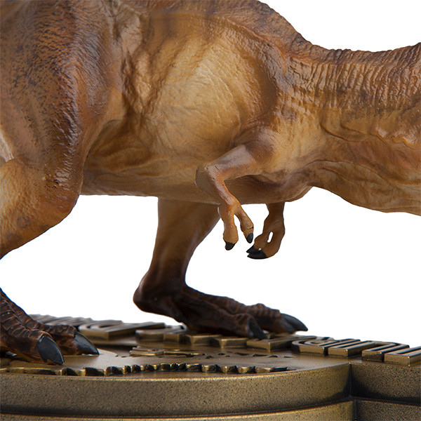 「霸王龍 全身迷你雕像」高約11.4 公分,將牠收拾完迅猛龍、怒吼的樣貌逼真再現,Chronicle Collectibles 以高水準的製作技術,在小巧的尺寸裡精彩地刻劃出恐龍皮膚的粗糙質感,身上的紋路、肌肉線條也都有出色的表現,除了霸王龍本體外,以《侏羅紀公園》招牌LOGO 為題製作的金色地台更是提升了本作的收藏價值,雖然迷你但展示效果超讚,彷彿同時聽見經典配樂和恐龍吼叫聲在耳邊響起了~!