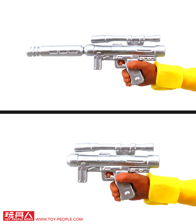 ▼ 爆能手槍(Blaster Pistol)前端的消音器也能自由拆裝。關於這把槍還真的有點來頭,原來它其實是1976年時、最初設計給風暴兵的原型版爆能槍呢!