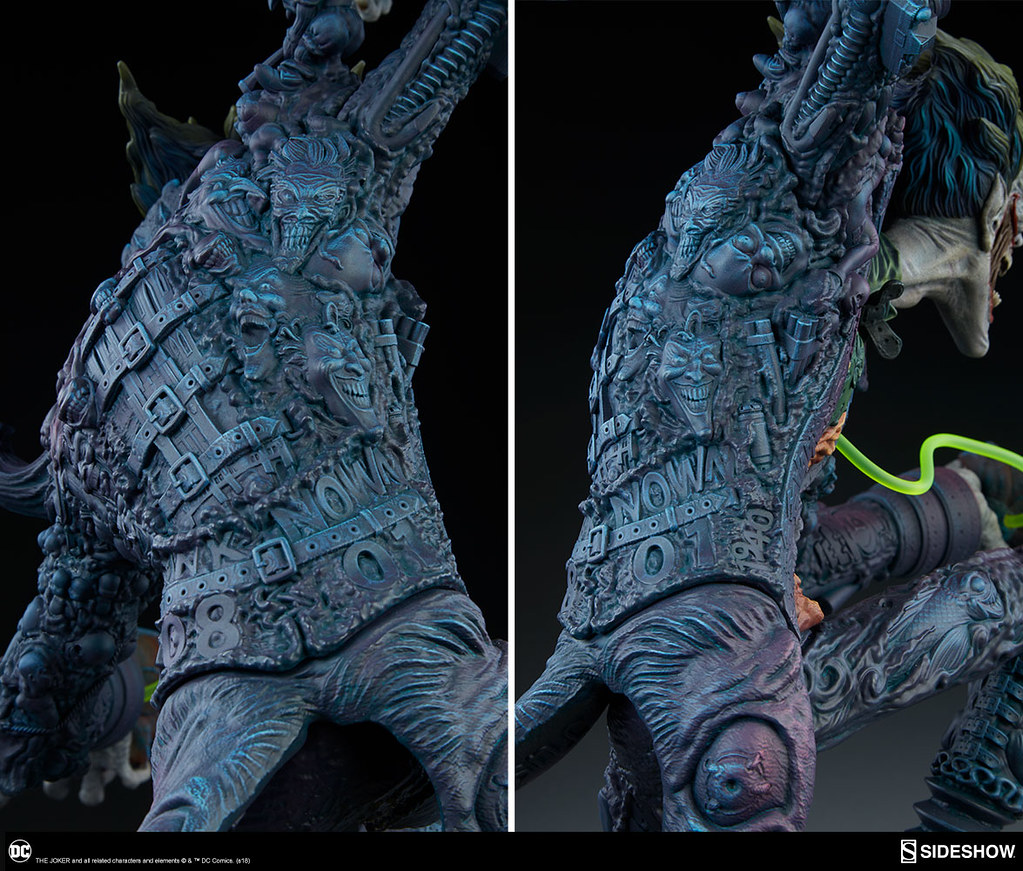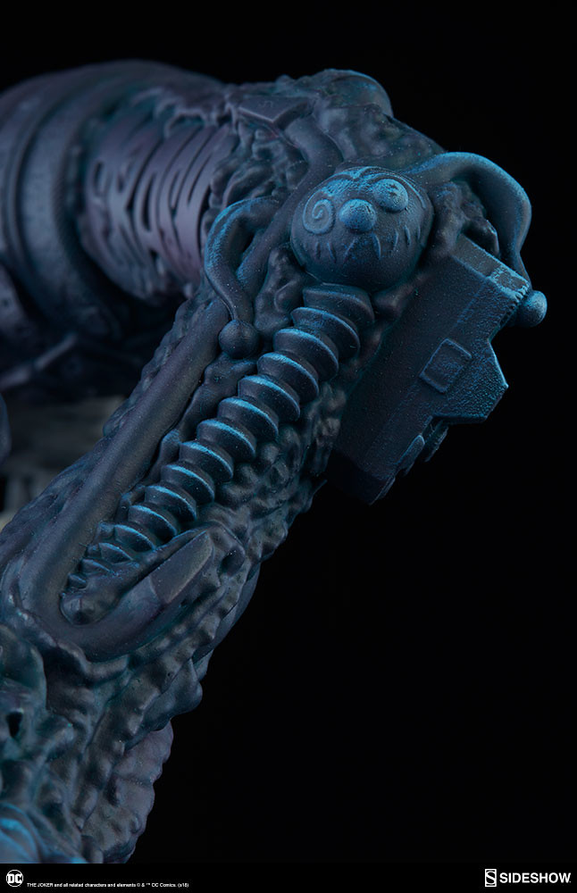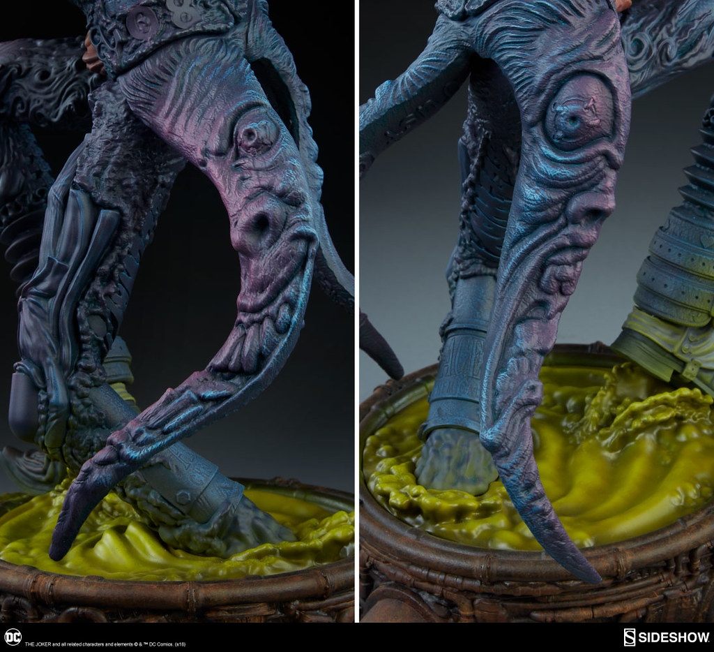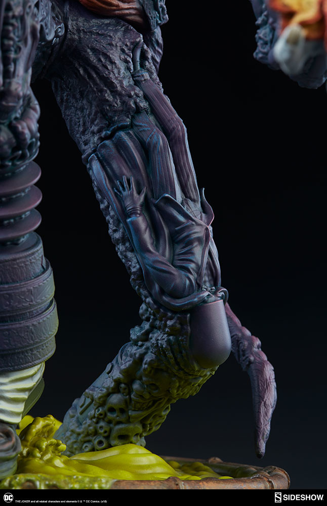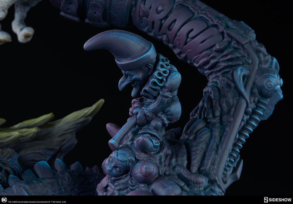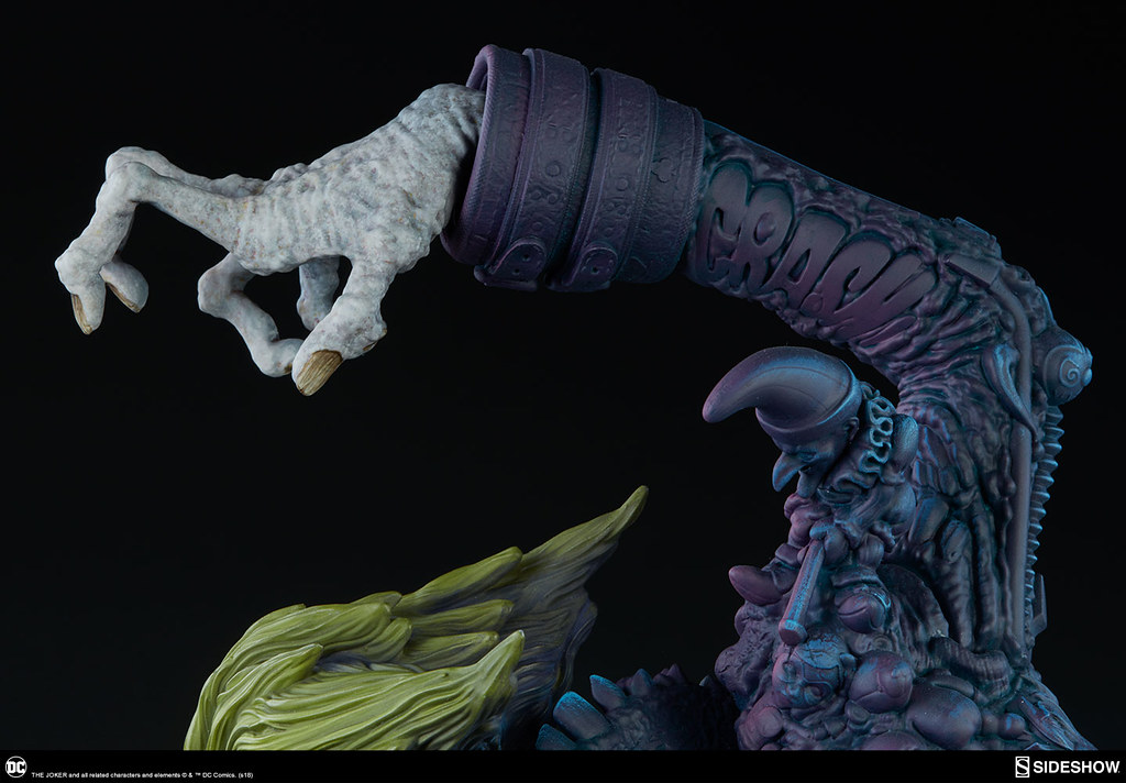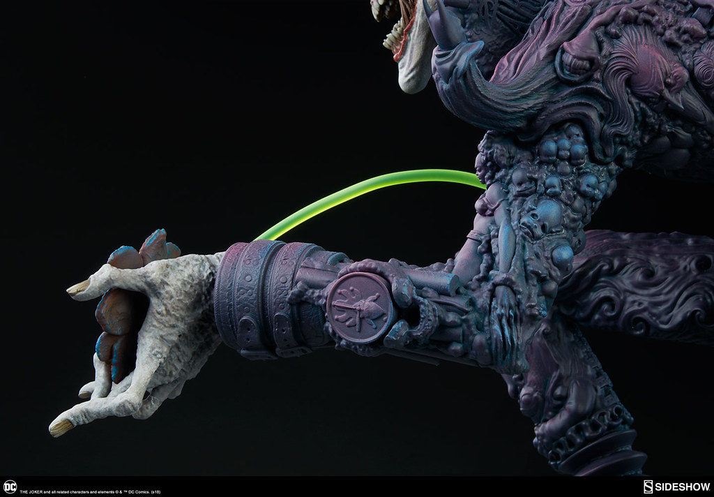 如果說前作的「蝙蝠俠」是類似於惡魔蝙蝠俠的不死生物,那這次的小丑就是與毒氣發生連鎖反應、或是在恐懼幻覺之下誕生的瘋狂產物!本作高約50.8 公分,呈現出小丑彷彿剛從浸滿綠色化學物質的水缸浮現一般,一隻腳還深陷其中,不只是身體皮膚,連同全身的服裝全都和充滿毒性的綠色液體起了反應,蒼白的臉孔、乾枯的手指、蠟黃的指甲全都施以精緻的造型刻畫,被割開的嘴巴邊緣竟快要貼近眼角,不管是範圍大小還是有如殭屍般的肌肉都令人毛骨悚然。