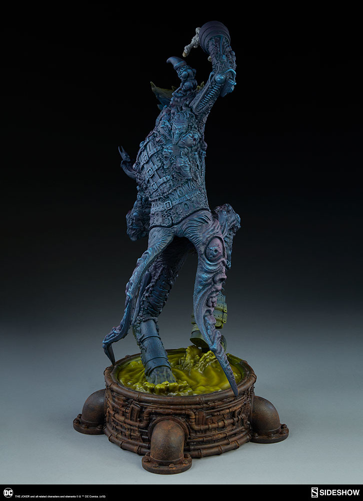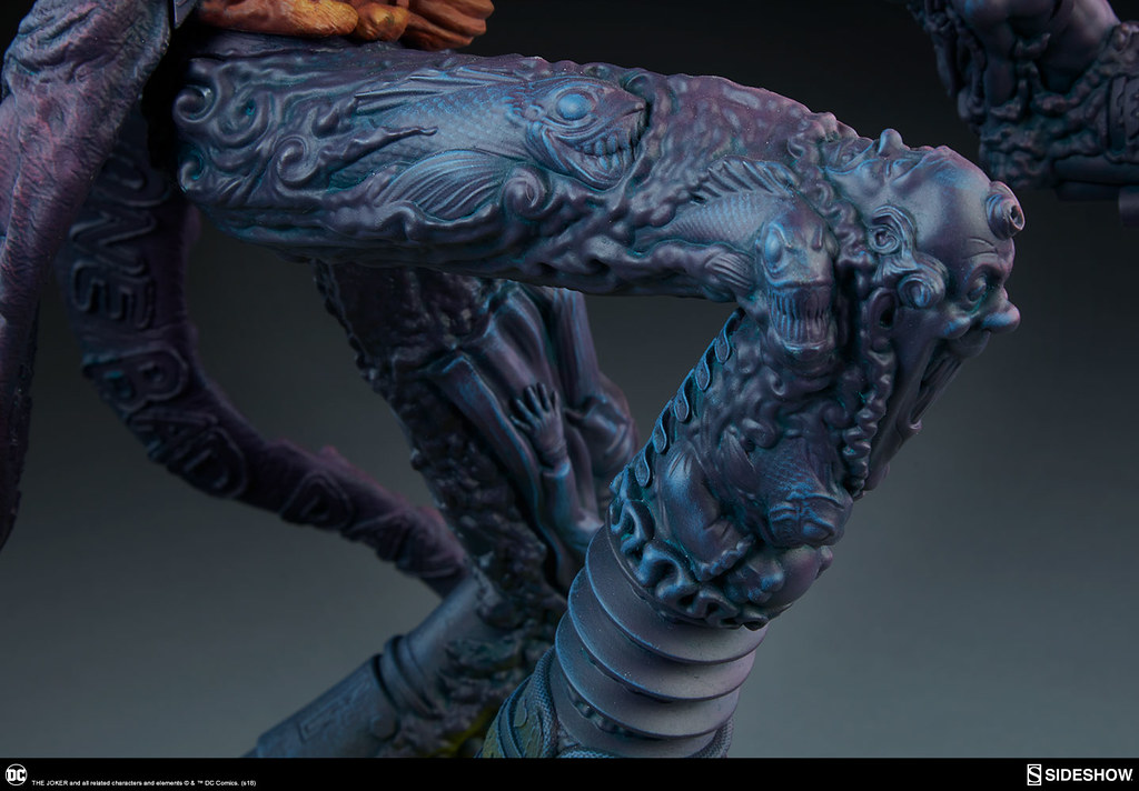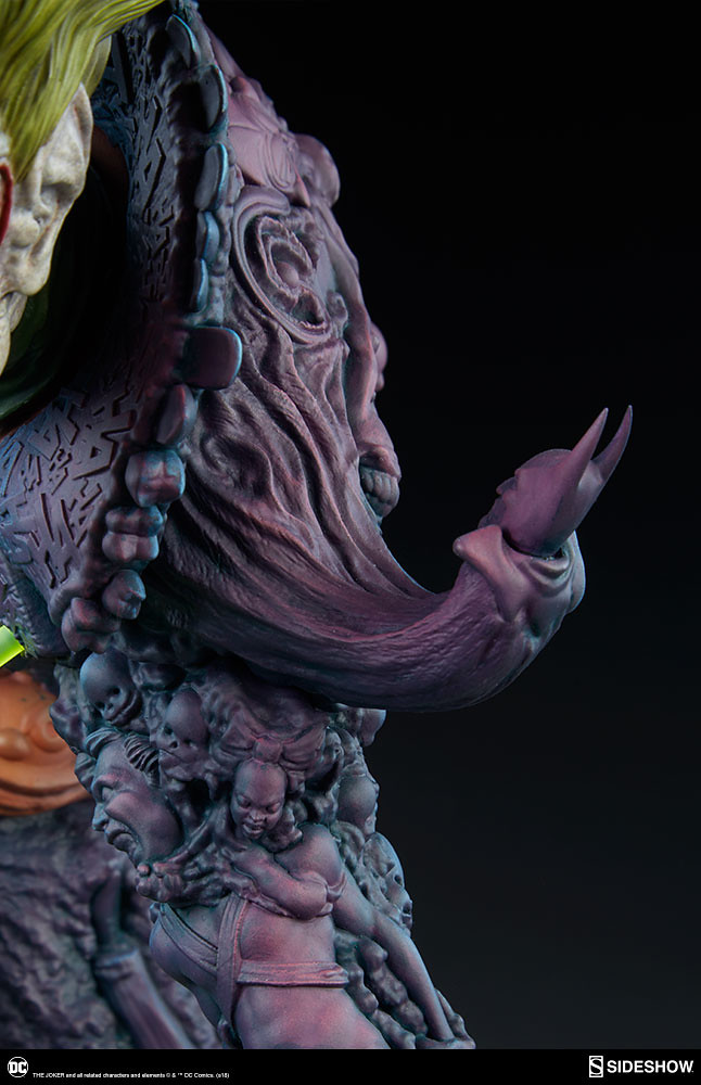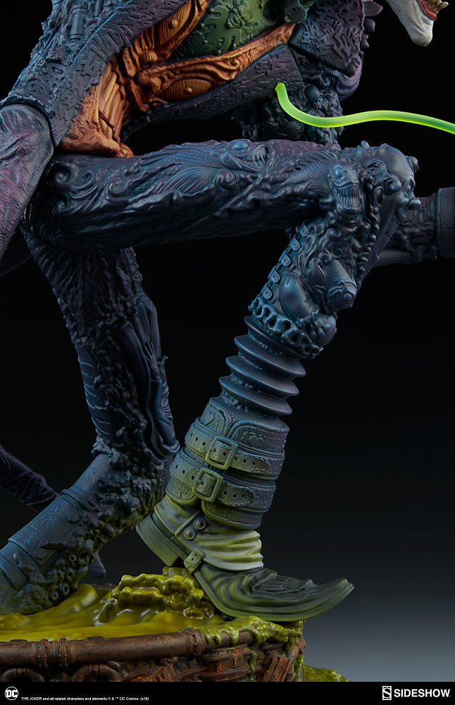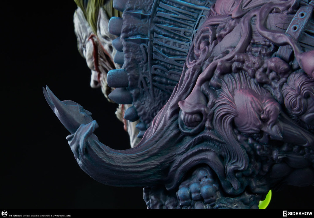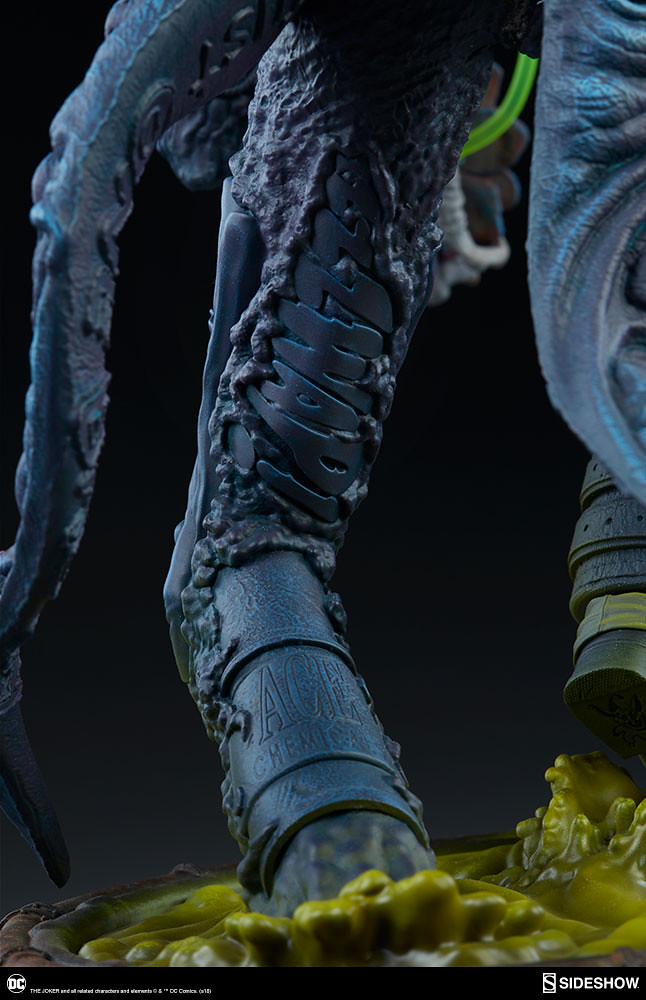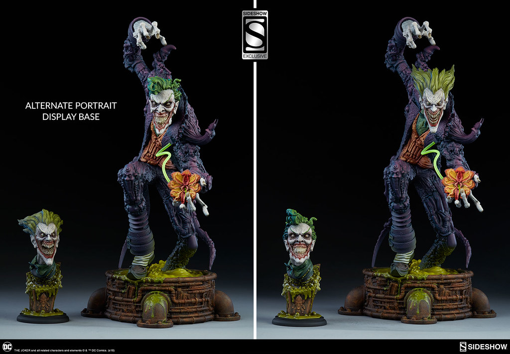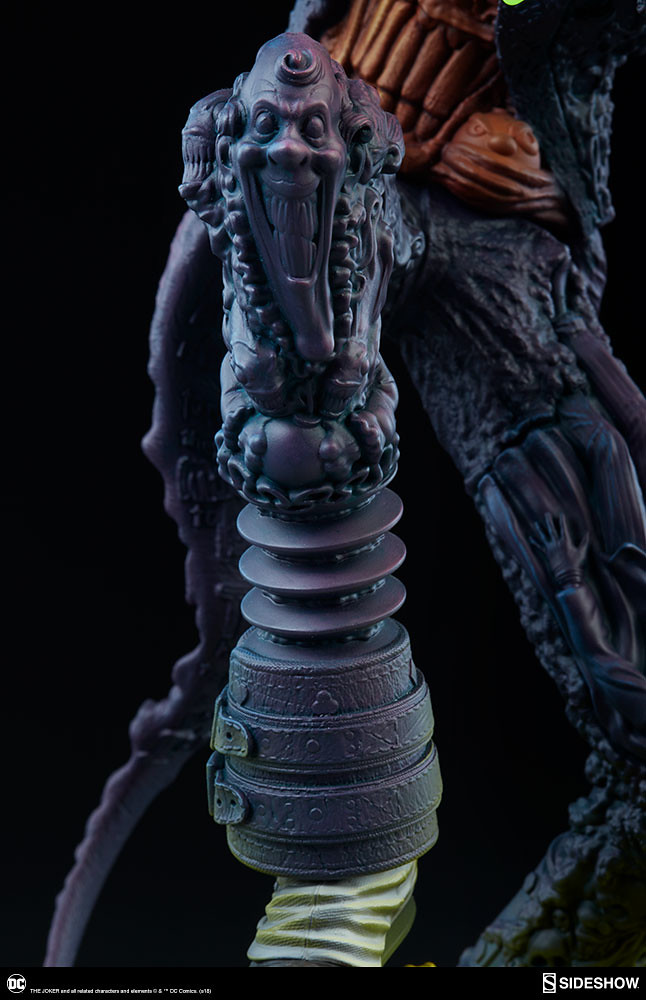 如果說前作的「蝙蝠俠」是類似於惡魔蝙蝠俠的不死生物,那這次的小丑就是與毒氣發生連鎖反應、或是在恐懼幻覺之下誕生的瘋狂產物!本作高約50.8 公分,呈現出小丑彷彿剛從浸滿綠色化學物質的水缸浮現一般,一隻腳還深陷其中,不只是身體皮膚,連同全身的服裝全都和充滿毒性的綠色液體起了反應,蒼白的臉孔、乾枯的手指、蠟黃的指甲全都施以精緻的造型刻畫,被割開的嘴巴邊緣竟快要貼近眼角,不管是範圍大小還是有如殭屍般的肌肉都令人毛骨悚然。