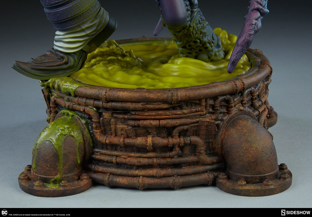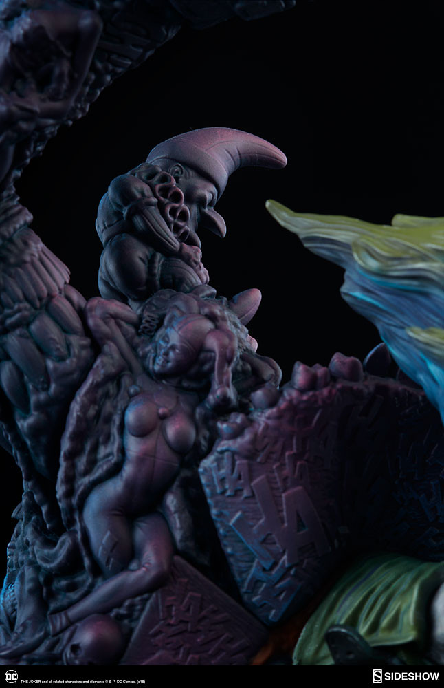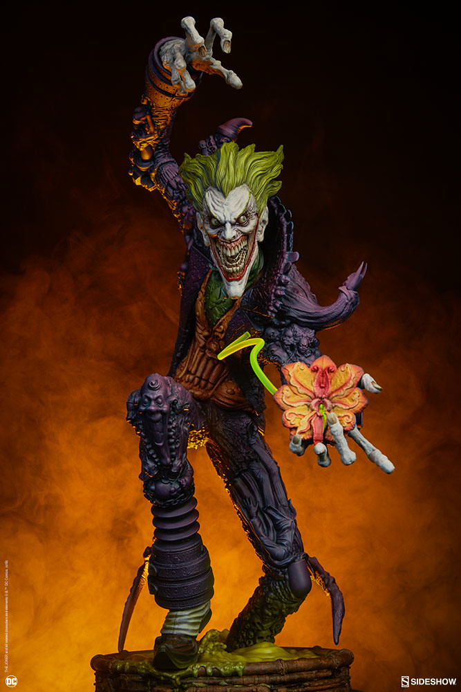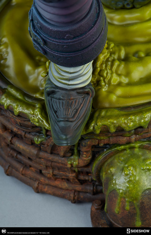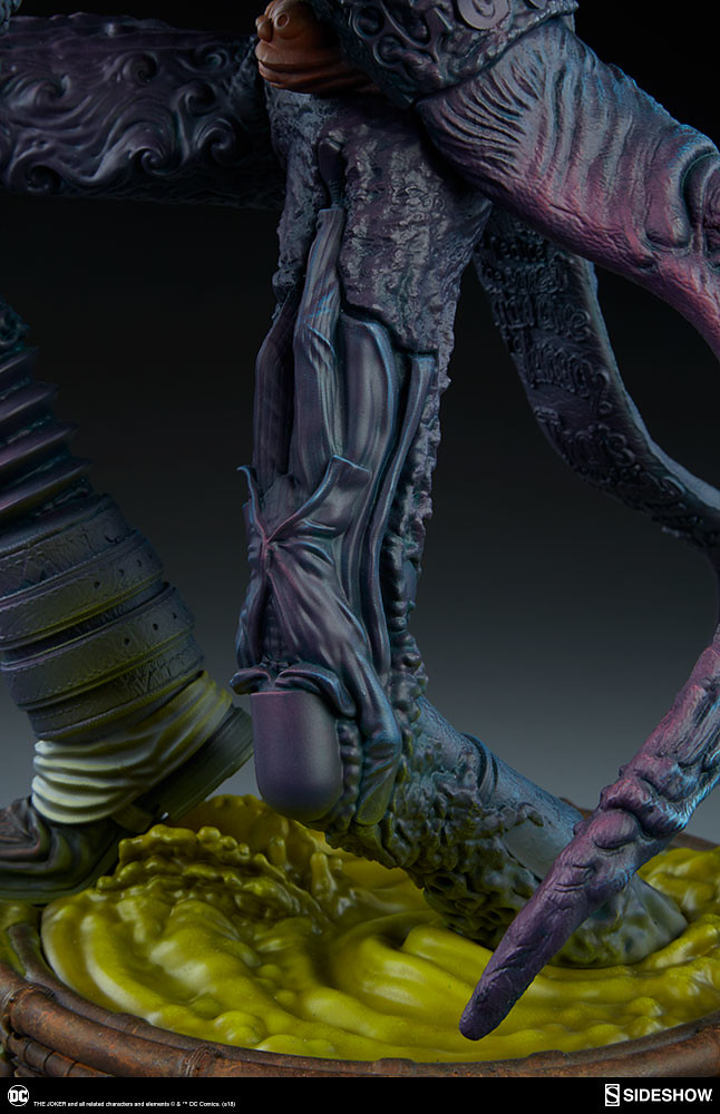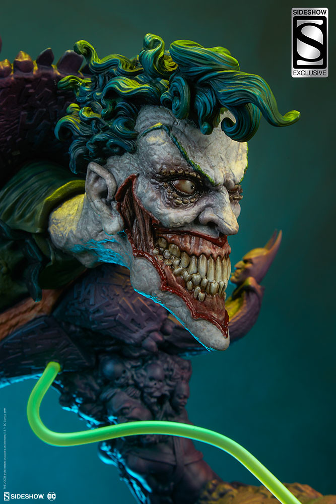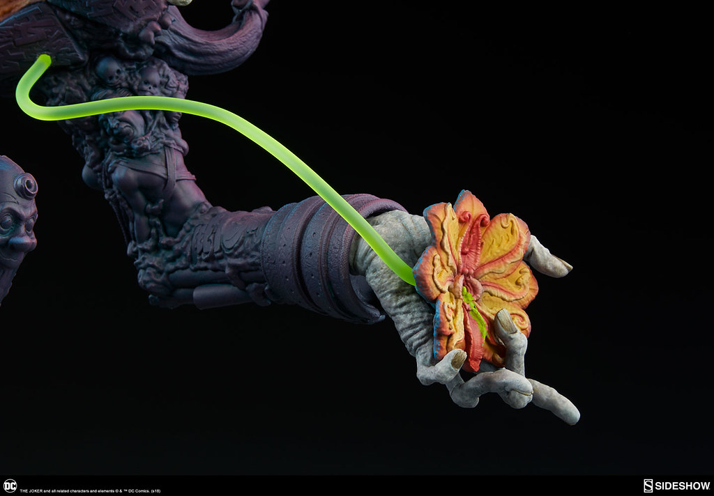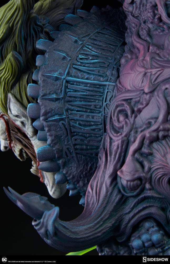 如果說前作的「蝙蝠俠」是類似於惡魔蝙蝠俠的不死生物,那這次的小丑就是與毒氣發生連鎖反應、或是在恐懼幻覺之下誕生的瘋狂產物!本作高約50.8 公分,呈現出小丑彷彿剛從浸滿綠色化學物質的水缸浮現一般,一隻腳還深陷其中,不只是身體皮膚,連同全身的服裝全都和充滿毒性的綠色液體起了反應,蒼白的臉孔、乾枯的手指、蠟黃的指甲全都施以精緻的造型刻畫,被割開的嘴巴邊緣竟快要貼近眼角,不管是範圍大小還是有如殭屍般的肌肉都令人毛骨悚然。