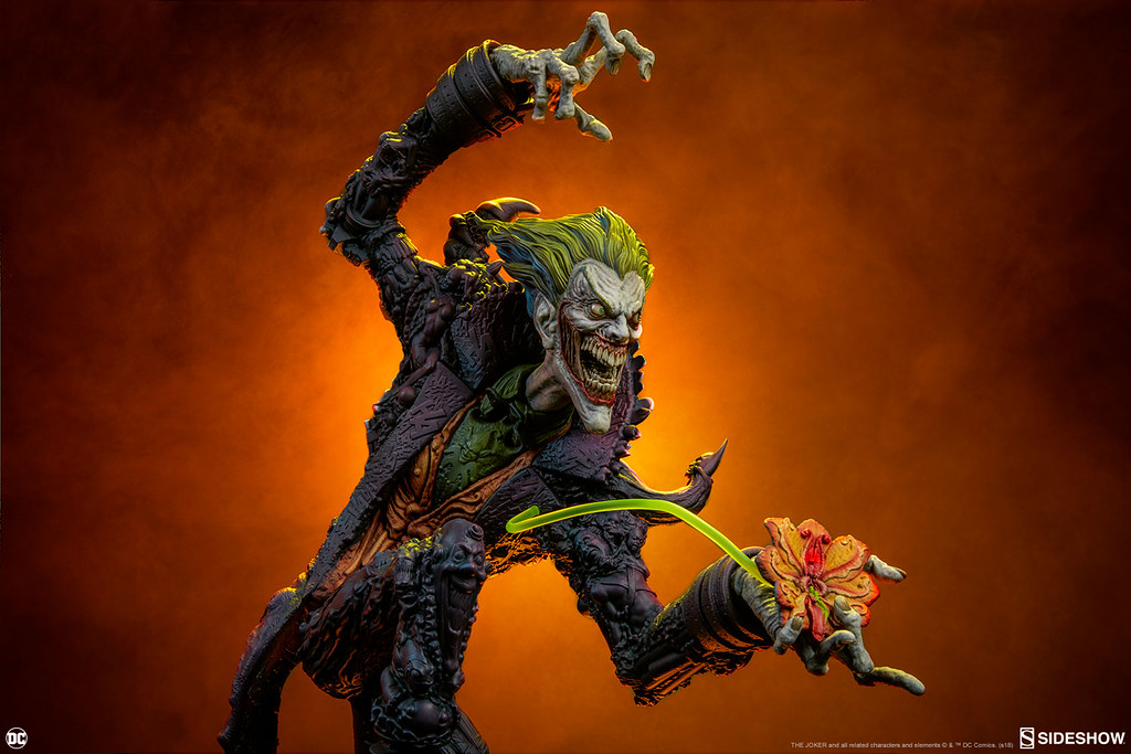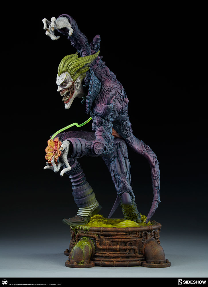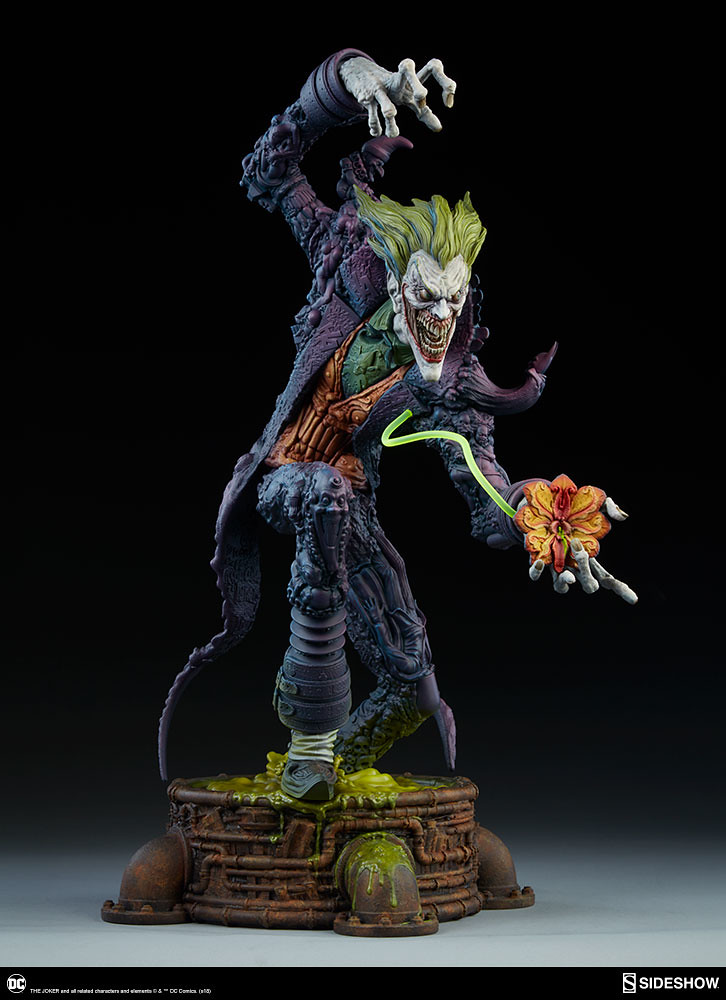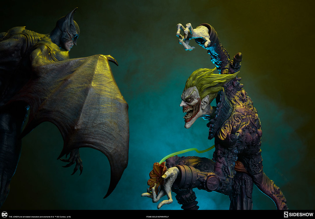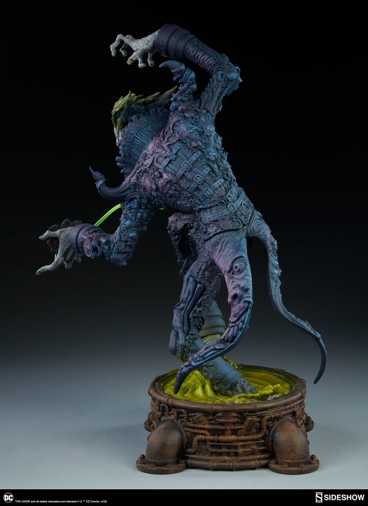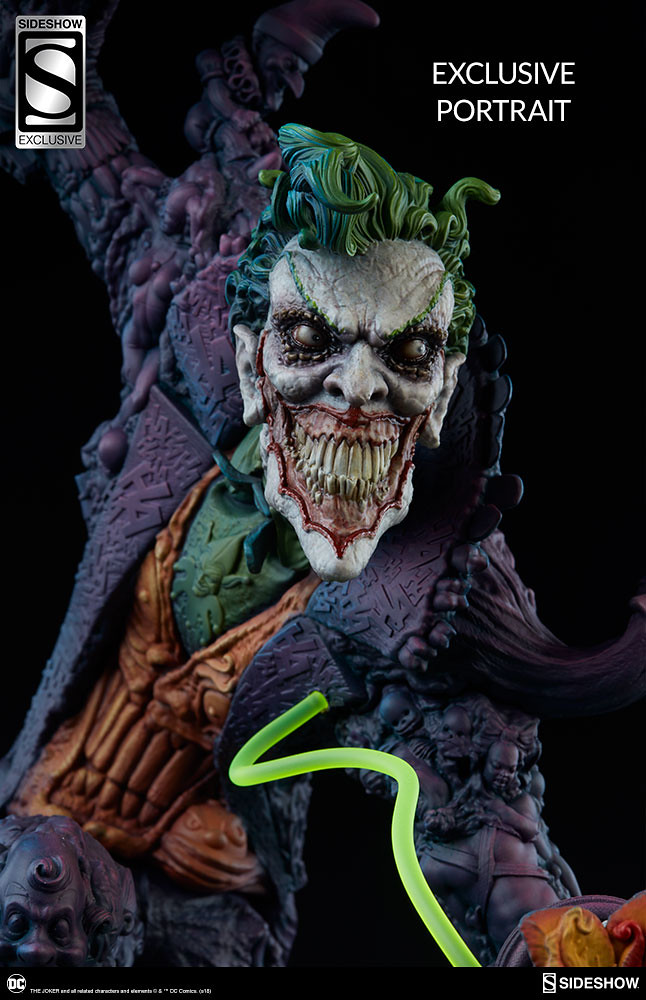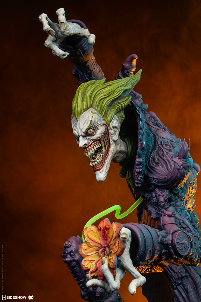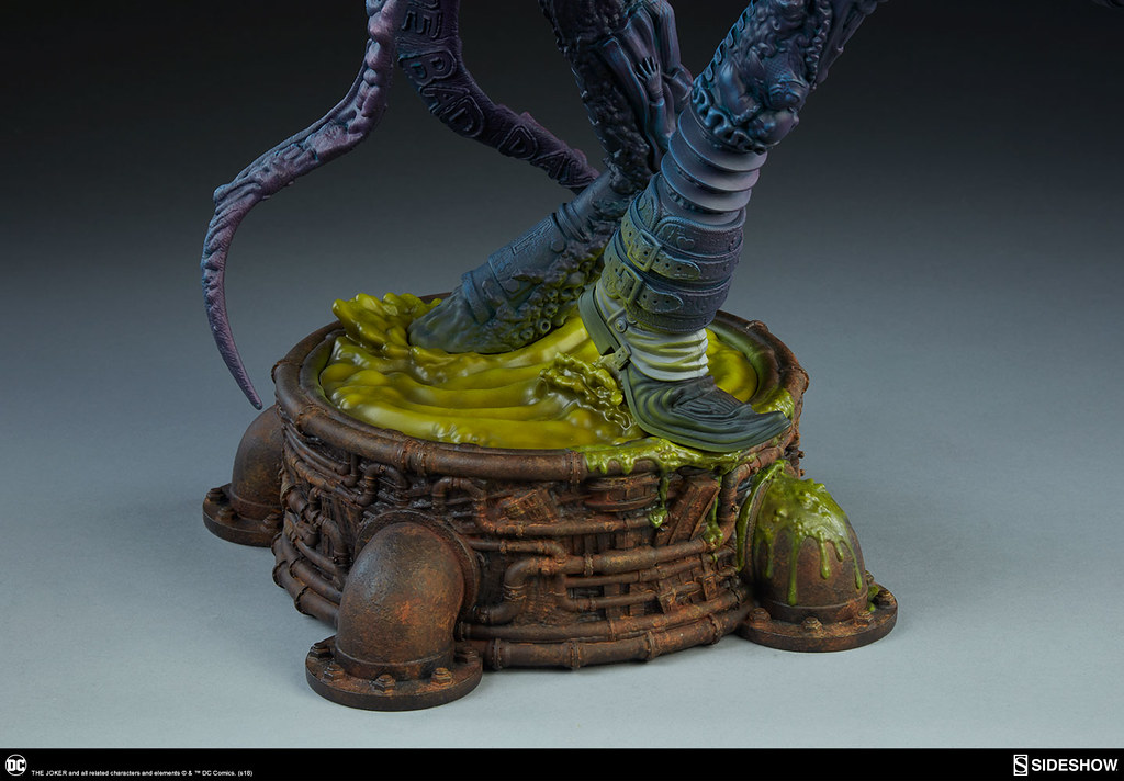 如果說前作的「蝙蝠俠」是類似於惡魔蝙蝠俠的不死生物,那這次的小丑就是與毒氣發生連鎖反應、或是在恐懼幻覺之下誕生的瘋狂產物!本作高約50.8 公分,呈現出小丑彷彿剛從浸滿綠色化學物質的水缸浮現一般,一隻腳還深陷其中,不只是身體皮膚,連同全身的服裝全都和充滿毒性的綠色液體起了反應,蒼白的臉孔、乾枯的手指、蠟黃的指甲全都施以精緻的造型刻畫,被割開的嘴巴邊緣竟快要貼近眼角,不管是範圍大小還是有如殭屍般的肌肉都令人毛骨悚然。