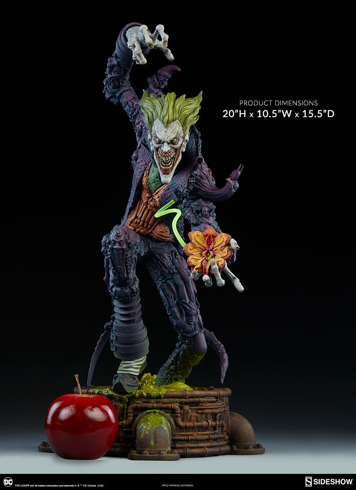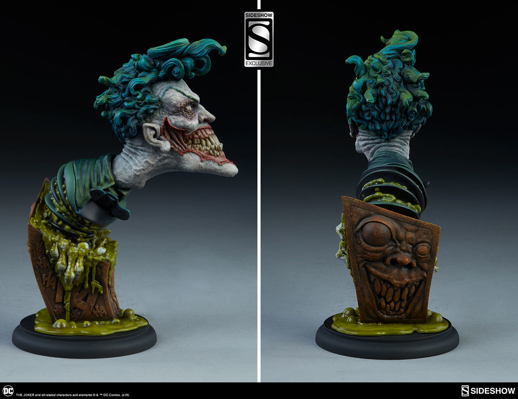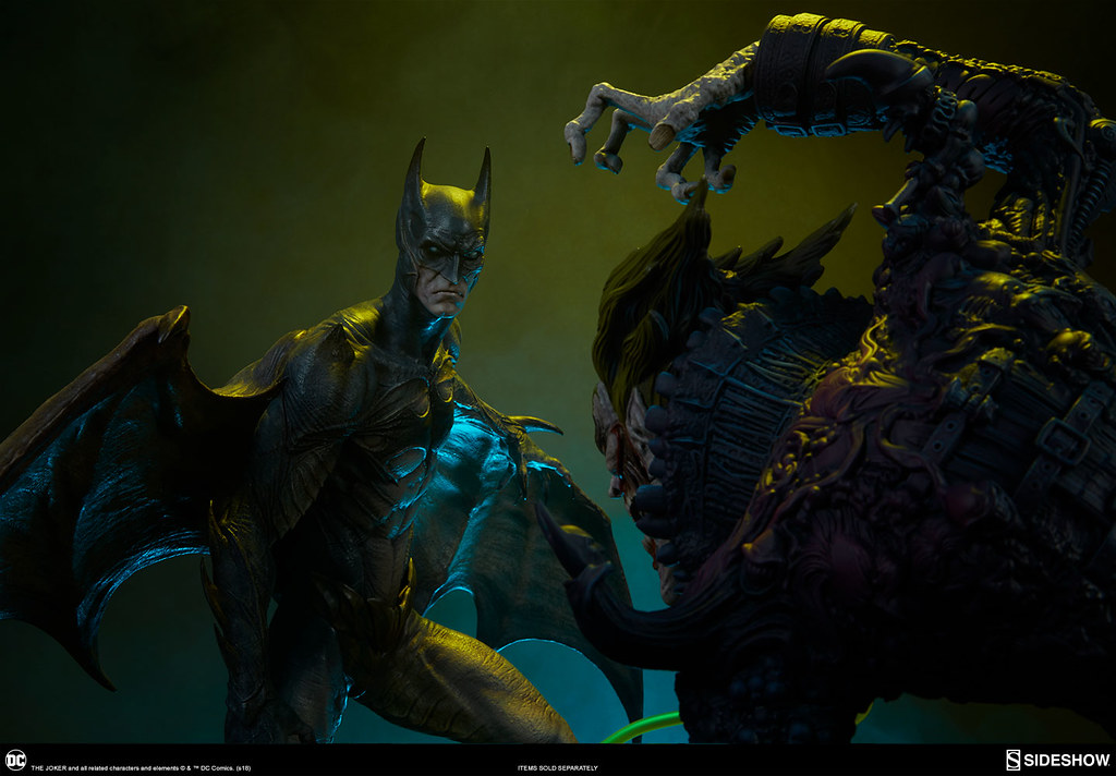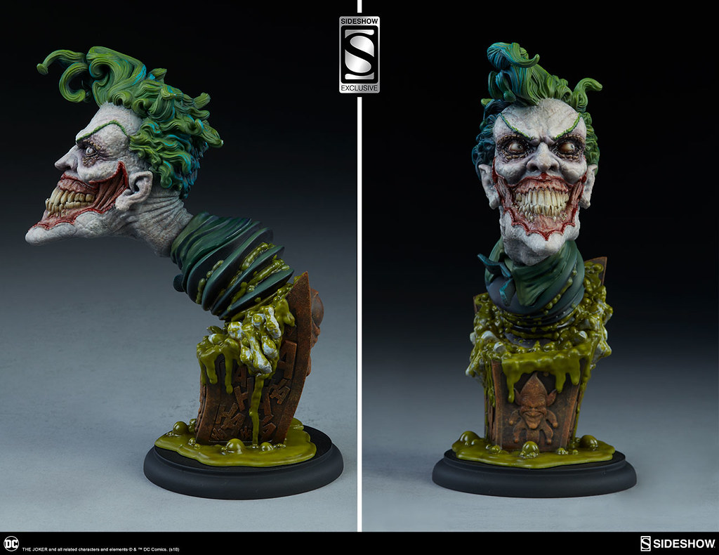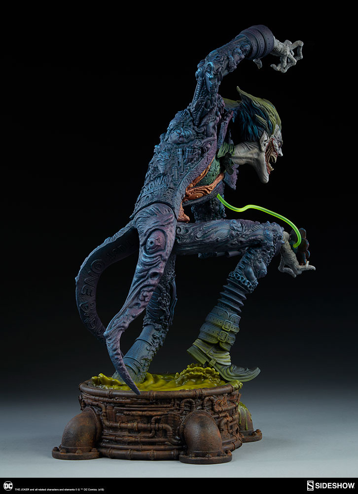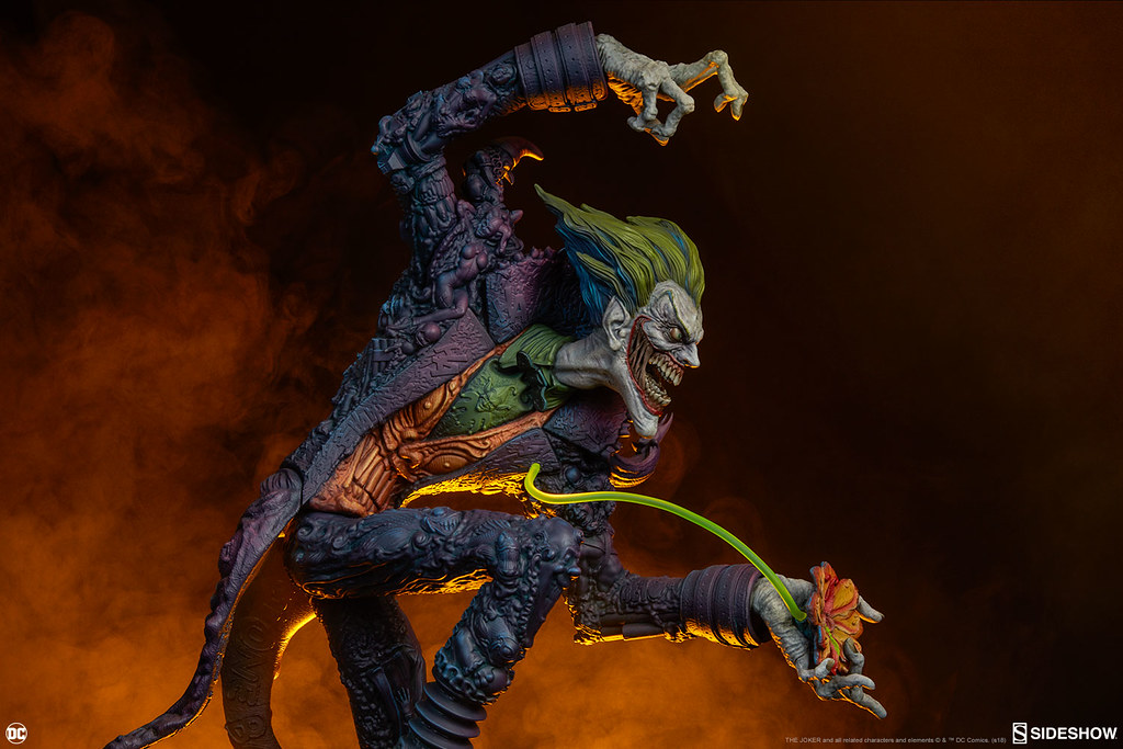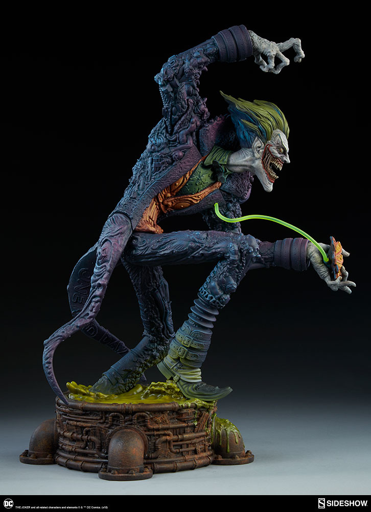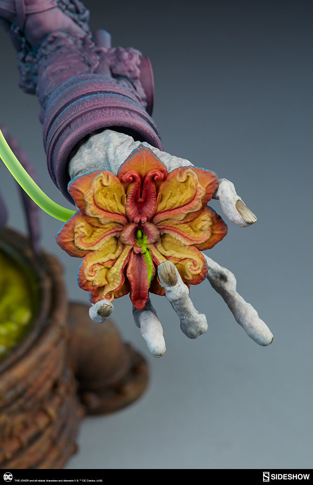如果說前作的「蝙蝠俠」是類似於惡魔蝙蝠俠的不死生物,那這次的小丑就是與毒氣發生連鎖反應、或是在恐懼幻覺之下誕生的瘋狂產物!本作高約50.8 公分,呈現出小丑彷彿剛從浸滿綠色化學物質的水缸浮現一般,一隻腳還深陷其中,不只是身體皮膚,連同全身的服裝全都和充滿毒性的綠色液體起了反應,蒼白的臉孔、乾枯的手指、蠟黃的指甲全都施以精緻的造型刻畫,被割開的嘴巴邊緣竟快要貼近眼角,不管是範圍大小還是有如殭屍般的肌肉都令人毛骨悚然。