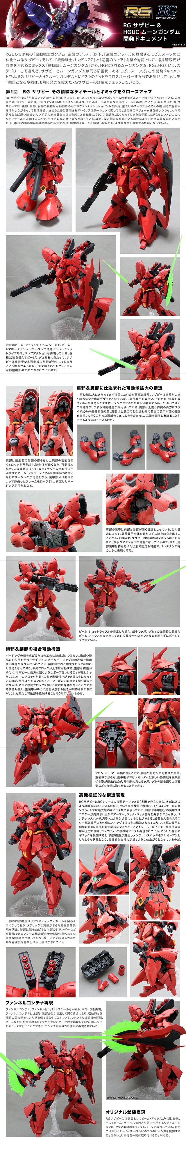 「RG 1/144 MSN-04 沙薩比」從機體外型、油壓管之類的內構到感應砲等武裝,忠實再現了劇中形象,同時也針對機體結構進行實機考證,追加了部份裝甲、背包等猶如當年「MG 1/100 沙薩比 VER.KA」的展開機構。透過 Advanced MS Joint 骨架讓多處裝甲具備可動結構,大幅提昇可動範圍!當然,沙薩比的多種代表性武裝包含「大型光束步槍」、「光束戰斧」、「光束軍刀」、「盾牌」等也一併收錄!