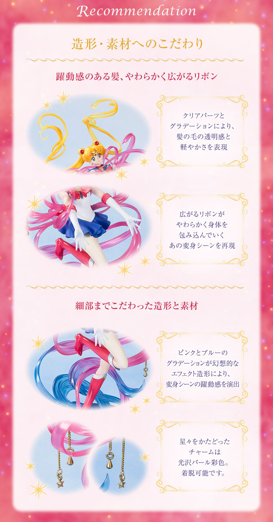 此次以故事主人翁「月野兔」經典的動畫變身過程來呈現,劇中的她可以使用"變身粉盒"借助月亮的力量來打擊犯罪,這次將畫面華麗地出現各式變身光線,以透明材質再加上色彩鮮艷的塗裝來表現,體態以及髮梢多處的躍動感都精彩呈現,此作將於PREMIUM BANDAI線上商店在2018年4月20日開始接受訂購,喜愛《美少女戰士》系列作品的玩具人可以參考一下歐!