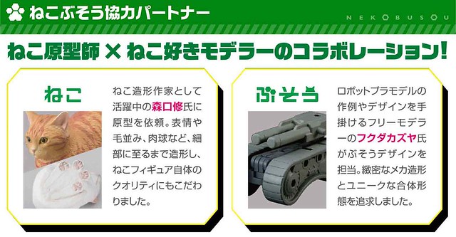 「武裝神喵(ねこぶそう)」邀請到了日本知名的貓咪原型師「森口修」參與貓咪本體的製作,而武裝部份則交由同為貓奴的模型製作家「フクダカズヤ(Kazuya Fukuda)」負責。