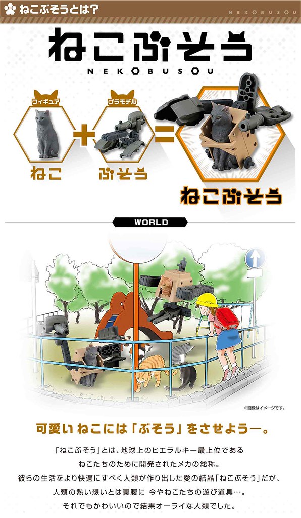 「武裝神喵(ねこぶそう)」在設定上是地球眾多貓奴為了讓至高無上的貓主人們生活更加舒適,竭盡所能發出來的「愛的結晶」,可以讓他們自行準備食物、幫其他的貓咪馬殺雞、拍照或用水消除佔領地盤的氣味...本應是如此,現在卻變成貓主人們的玩具,不過因為很可愛,所以貓奴們也就無所謂啦~