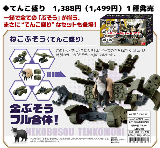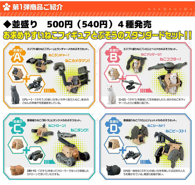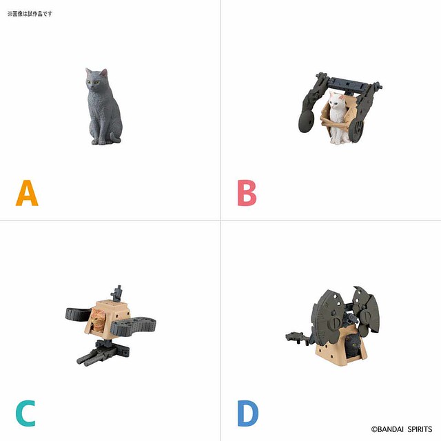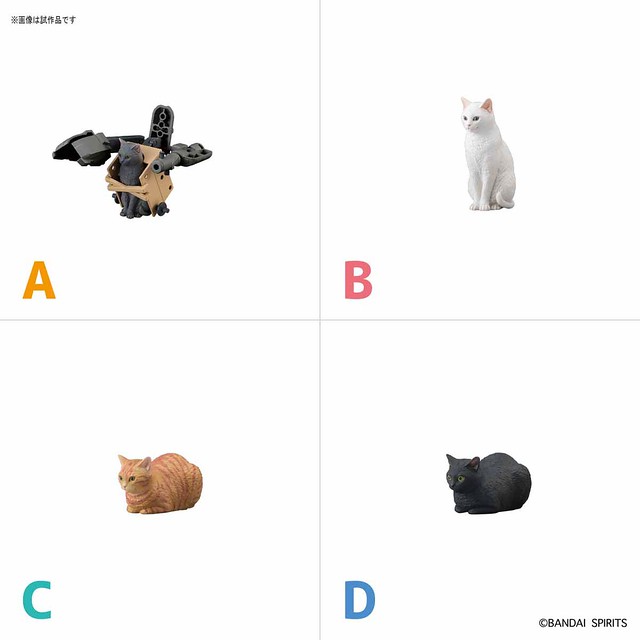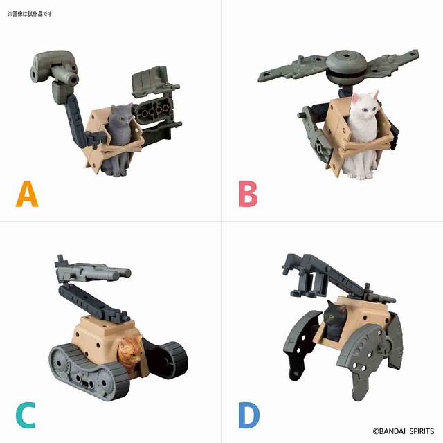 目前第一彈共有 ABCD 四種類。除此之外,BANDAI 也將推出一次收錄 ABCD 四種並施以特殊軍綠色成形的組合包「武裝神喵<超大碗>(ねこぶそう てんこ盛り)」!