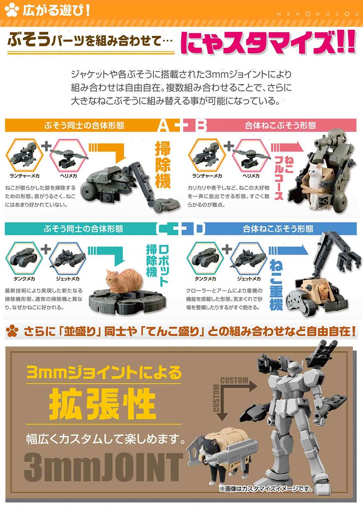 由「貓咪FIGURE」與「武裝」構成作品,讓貓咪穿上紙箱型或暖桌型的外裝後,就能透過統一規格 3mm 的孔洞連結武裝,依照官方設定的主題可以組成貓咪發射器、貓咪直昇機、貓咪戰車...等武裝,當然也可以自行發揮創意,任意拼裝成怪手或吸塵器之類的造型喔!