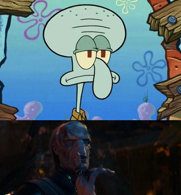 當薩諾斯旗下的黑暗號令其中兩位成員-黑曜獵手和烏木喉率先入侵紐約時,奇異博士看到烏木喉是用海綿寶寶的章魚哥來挖苦他的長相。