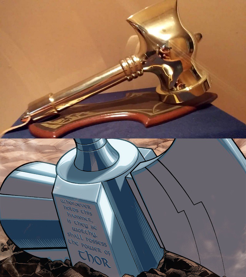 這次索爾拿到的新武器是由矮人之王重新打造,並由格魯特身上支幹做為材料的把柄,藉此誕生的雷神之鎚-風暴毀滅者。其造型當然是參考漫畫中與馬面雷神手上持有的同名雷神之鎚,再加上一點點終極宇宙版本的雷神之鎚其元素。