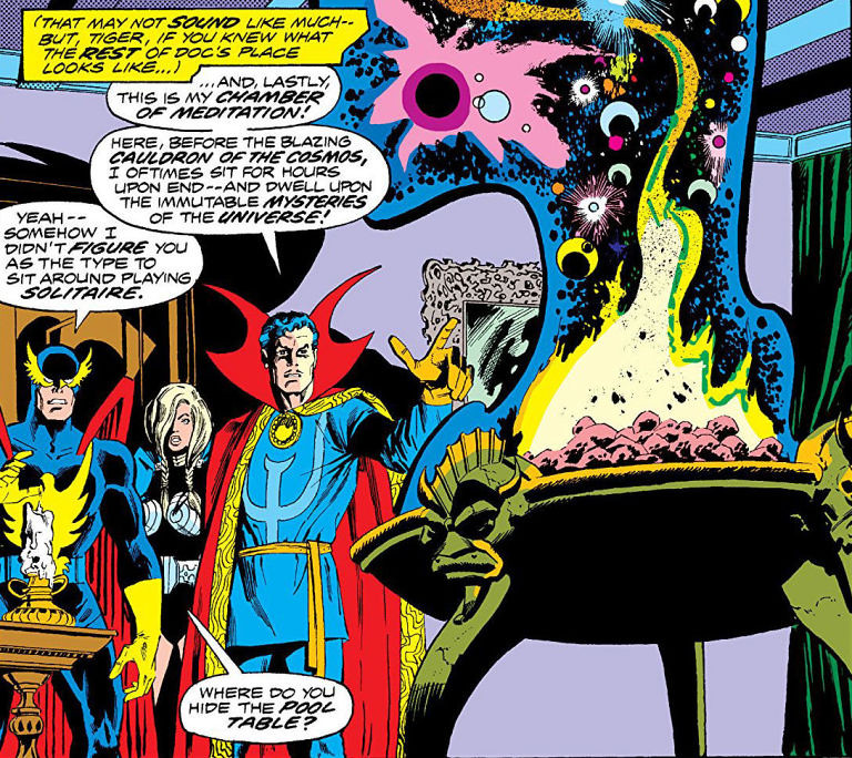 東尼第一次見到史傳奇時雙方都對彼此不禮貌,隨後東尼撞到了一個名為宇宙大鍋爐的東西,在漫畫中這個物品是奇異博士用來觀察時空的法器。