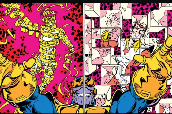 在螳螂女和德克斯對薩諾斯進行攻擊,我們的瘋狂泰坦用無限寶石將他們變成緞帶與切成好幾個方塊使其無力化,這無疑是致敬漫畫《無限手套》故事橋段。