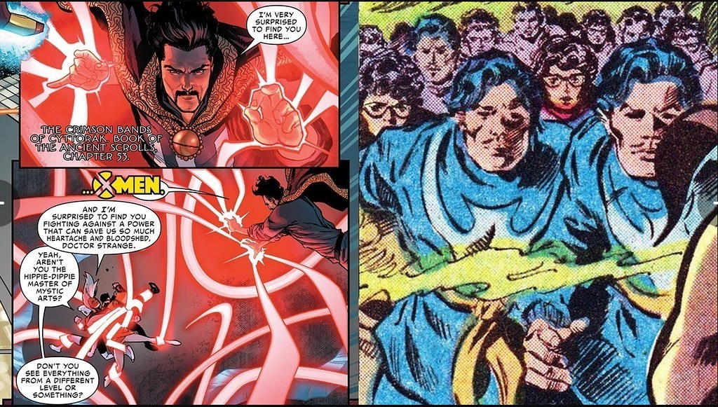 這次奇異博士有很多新的戰鬥方式,像是著名的緋紅段帶攻擊The Crimson Bands Of Cyttorak,再搭配另一個知名的魔法-分身術來迷惑薩諾斯,可因為對方有無限寶石導致這個強力攻勢馬上被識破並瓦解。