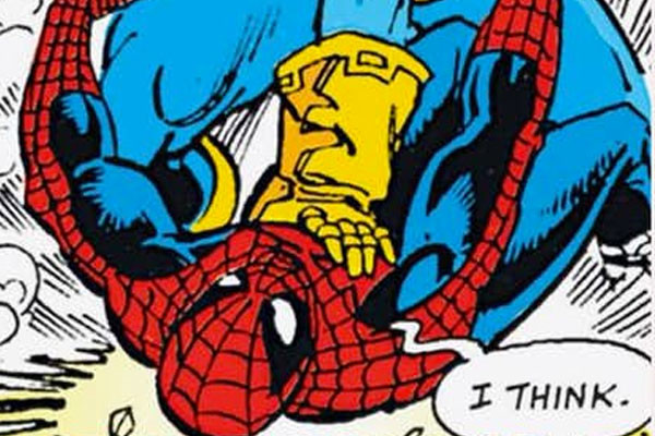 蜘蛛人用蜘蛛絲蓋住薩諾斯的臉,並想脫掉他手上的無限寶石,以及之後被薩諾斯壓倒在地,也是參考漫畫《無限手套》的場景。