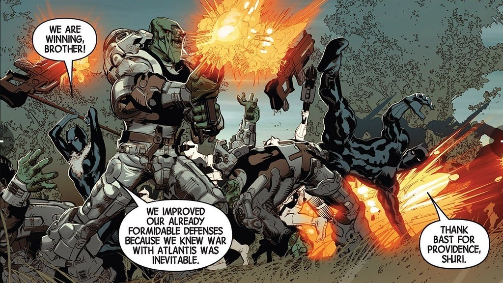 大戰設定在瓦坎達在電影是尋求庇護外,也是參考漫畫《無限》中,暗黑號令來襲擊瓦坎達獲取無限寶石的場景。