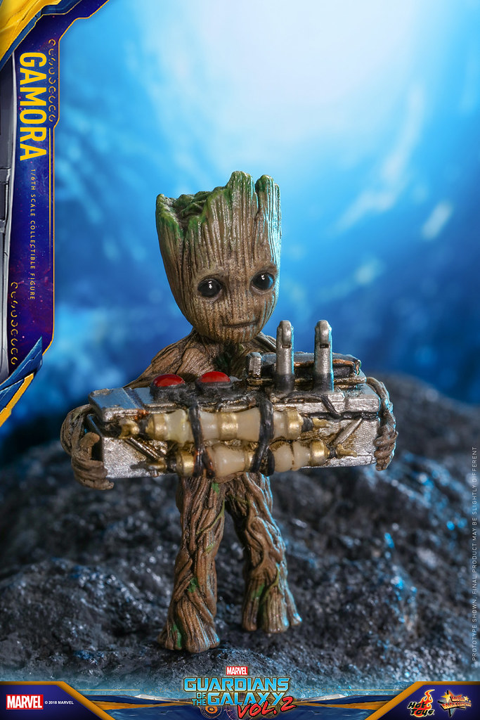 「葛摩菈 1/6 比例人偶」高約28公分,全身擁有28處可動關節,根據電影的資料設定充分還原其造型,能夠呈現出電影一開始的紫紅色長袖緊身衣和飛行背包,以及長版仿皮大衣搭配仿皮背心兩種樣貌,臉部精細地形塑出演員「柔伊·莎達娜」的輪廓,但眼神給人空靈的感覺,彷彿一直在想事情的樣子啊XD~紅色頭髮也有深淺不一的層次感,配件部分包含重型大砲、雕紋細緻的銀色長劍,伸縮前的短劍型態還可置放於腰帶中,令人驚喜的是還有個高約5 公分、拿著炸彈控制器的小格魯特歐~