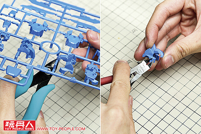 ▼ 使用厚刃斜口鉗來將零件從框架上剪下,在使用銳利的薄刃斜口鉗將湯口削平,每個零件都需要這樣細心地處理喔,結束後就能組裝了~
