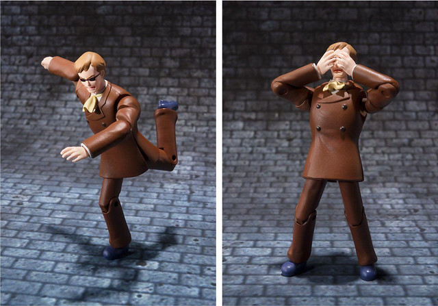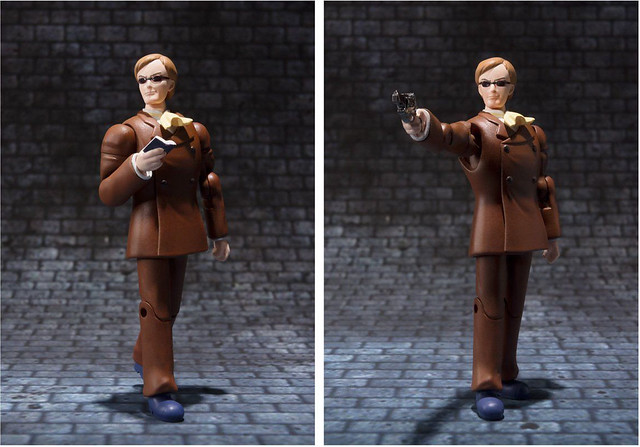 而重點當然是這個高約 7 公分,全身可動規格的「穆斯卡大佐」啦!穆斯卡大佐在肩部、手肘、膝蓋、腳踝等多處皆設有可動關節,並附上兩種表情、四種造型手掌,可再現劇中奔跑、持槍、拿著小手冊的反派形象,當然也能擺出被「巴魯斯!」後「眼睛、我的眼睛啊!!」被閃瞎的場景XDD!