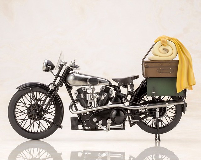 漢密斯則由曾協助多家大廠開發組裝模型商品的日本 PROTHLINK 公司製作,打造出原型來自經典車款「Brough Superior SS100」的精密車體,從引擎、懸吊系統到車輪胎紋等複雜的結構全都有讓人嘆為觀止的高完成度,並透過金屬色塗裝呈現相當真實的質感,在加上貨架上行李讓人感受到重量感!