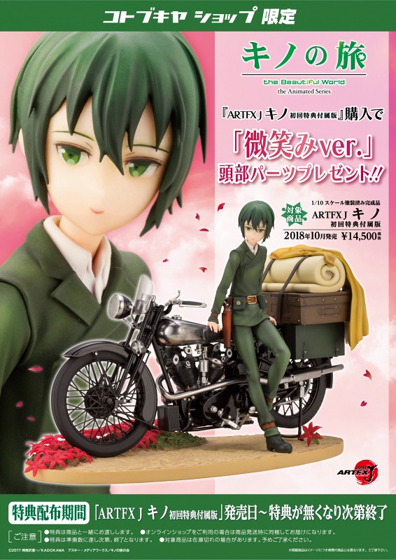 由日本壽屋玩具公司(KOTOBUKIYA)發行,打造日本動漫畫、遊戲角色精緻立體作品的「ARTFX J」系列今(10)日發表了最新商品,來自人氣輕小說作品《奇諾之旅》的「ARTFX J 奇諾 1/10比例模型」預計於 2018 年 12 月發售的消息。