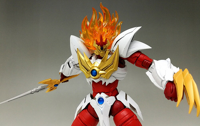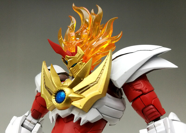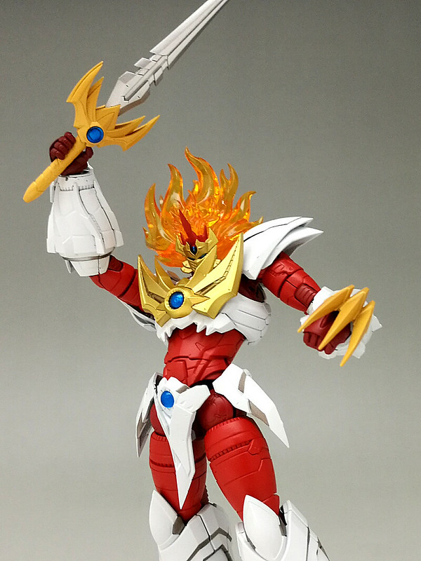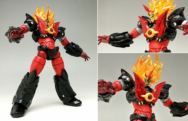 「魔神凱薩雷牙(マジンカイザーライガ)」如火焰般的毛髮部份採用四層構造的硬質透明零件製作,內部同樣也具備指揮艇構造。金色的面罩、胸部放熱板皆為塗裝完成零件。替換頭部與爪就能互換「魔神模式」與「獸神模式」。雷牙的零件規格與過去發售的魔神凱薩、刃皇共通,因此可自由組合出你專屬的原創魔神!