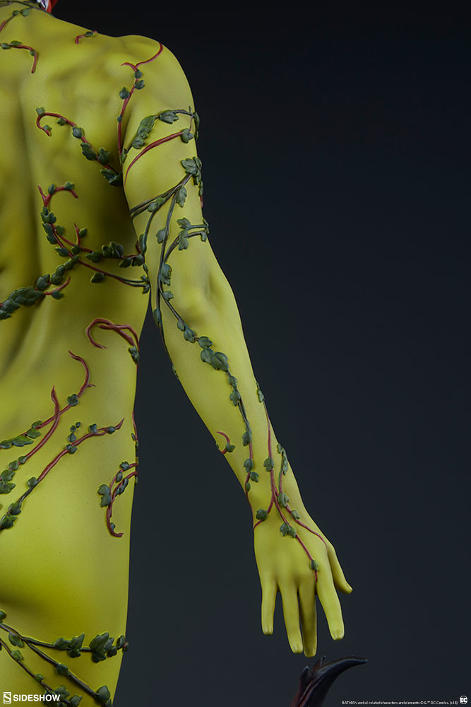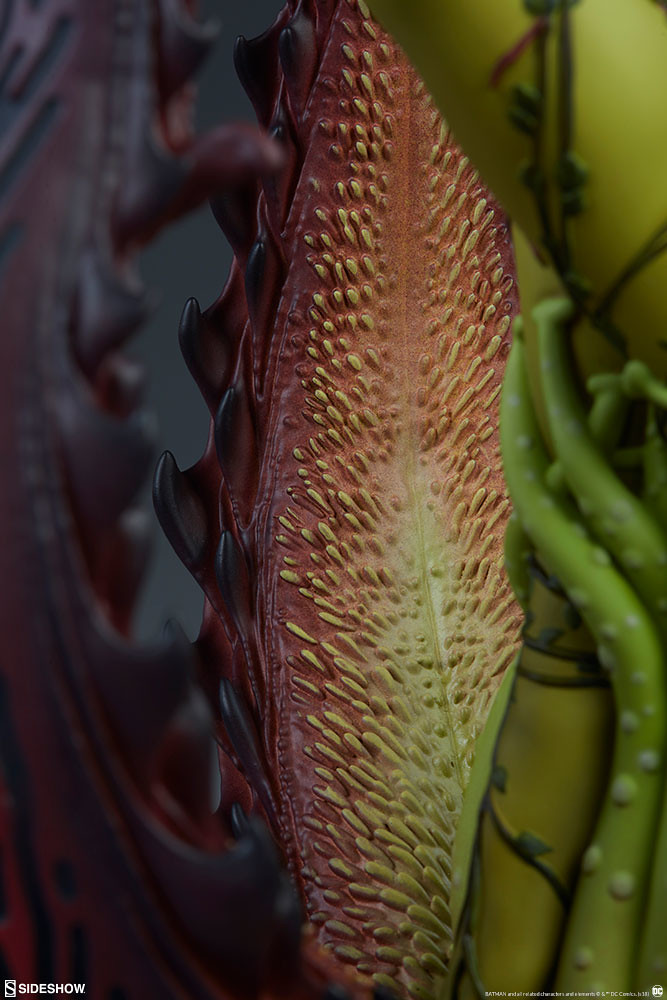 「毒藤女 1/4 比例全身雕像」高約55.8 公分,以近乎全裸、只用葉片遮住重點部位的大膽設計,充分展現出她身為性感反派的角色設定,橘紅色的頭髮和全身呈現翠綠的身體形成強烈的對比,纏繞於身的藤蔓則寫實刻劃出植物的根、莖、葉質地,以特殊植物和碎裂石塊為題製作的地台有著破地而出的動感,塗裝與造型都有細緻的描繪,而EX 版中還附屬了髮型更加狂野的奸詐笑頭雕喔!