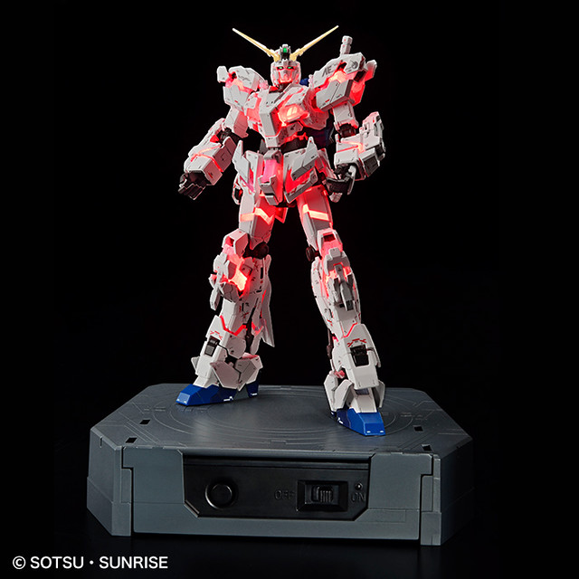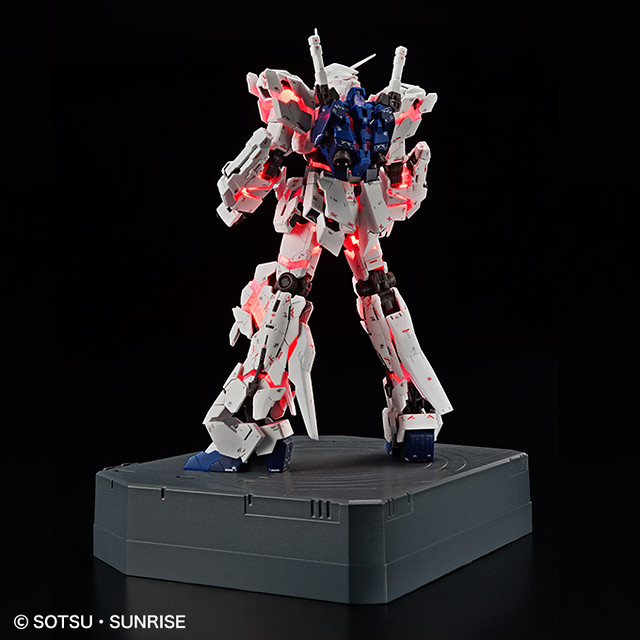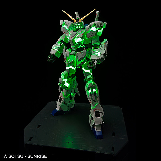 「RG /1/144 RX-0 獨角獸鋼彈(毀滅模式)Ver.TWC(LIGHTING MODEL)」是將矗立於台場「等身大獨角獸鋼彈」的魅力透過 1/144 比例再現的「非可動展示用模型」,擁有與RG版本相同的精密細節,多處骨架內設有LED燈,配線與電池則設計在專用底座內,透過底座上開關與按鈕,就能變化 3 種發光模式!