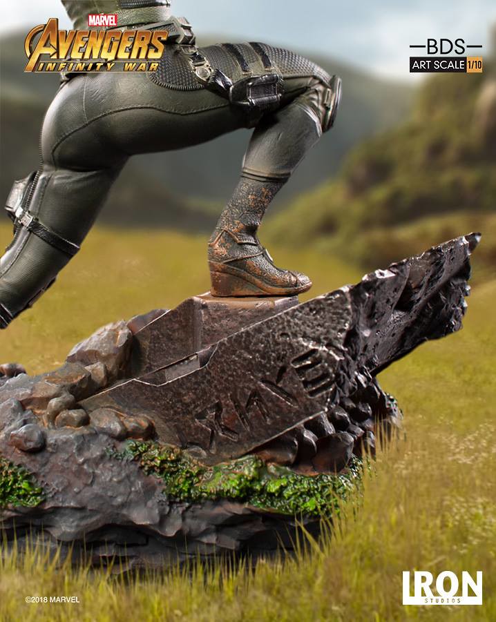 「黑寡婦 1/10 比例決鬥場景雕像」高約18.5 公分,根據電影的3D 資料設定逼真地再現躍動感十足的戰鬥姿態,延展的四肢極具張力,從飄逸的金色短髮到全身的裝備都施以精緻的刻畫,胸、腰、臀的身形曲線也細膩形塑,並以高水準的製作技術充分展現服裝、靴子沾染泥土的舊化,搭配以瓦干達背景為主題的地台讓本作更有故事性,寫實感也再提升,值得一提的是地台能夠與別的英雄角色地台做連接,再現瓦干達戰役的熱血場景喔。