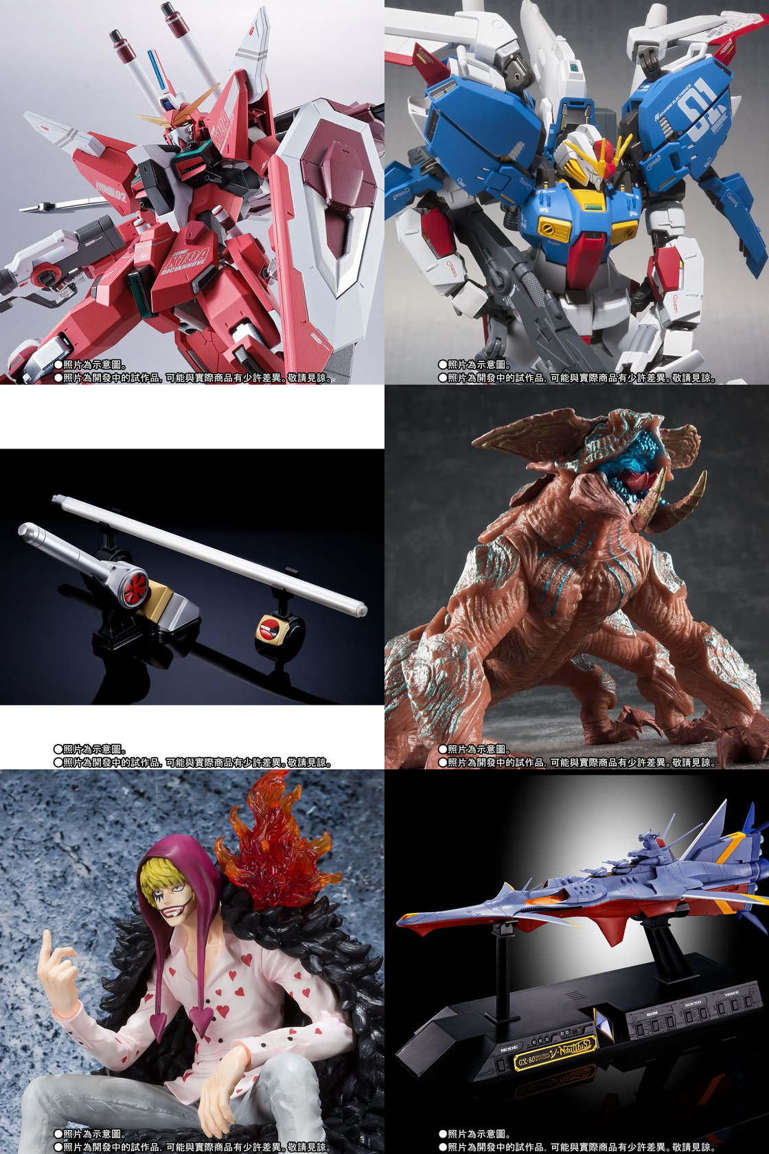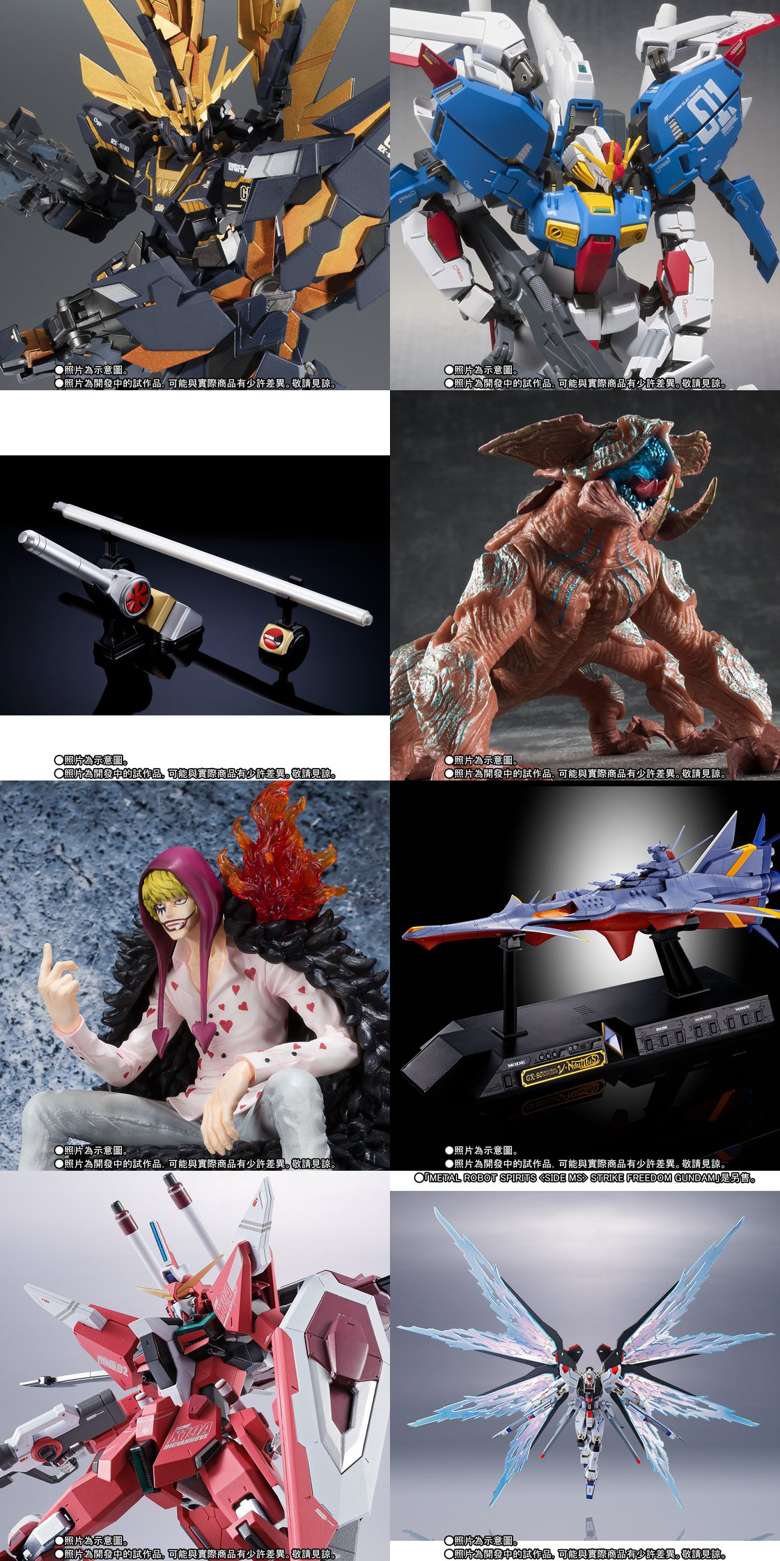 圖說:由左到右由上到下依序為本次展示品「ROBOT魂 報喪女妖命運女神型SP PACK [REAL MARKING Ver.]」、「METAL ROBOT魂 (Ka signature) S鋼彈」、「TAMASHII Lab 假面騎士BLACK RX 光子劍REVOLCANE」、「SOFVI魂 蛇蠍怪」、「Figuarts Zero 柯拉遜」、「超合金魂 海底兩萬哩 GX-80 新鸚鵡螺號」、「METAL ROBOT 魂