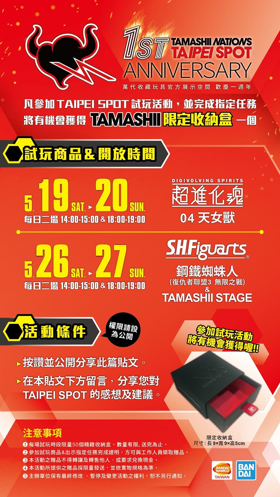 凡於5月19日(六)、20日(日)、26日(六)、27(日)至TAMASHII NATIONS TAIPEI SPOT參加試玩活動,公開分享活動貼文並留言,就有機會獲得特製收納盒(尺寸約9*9*5公分)!每個試玩時段限量贈送50個。詳情請至TAMASHII NATIONS Taiwan官方粉絲團:(https://www.facebook.com/pg/tamashiiFanclub)確認!