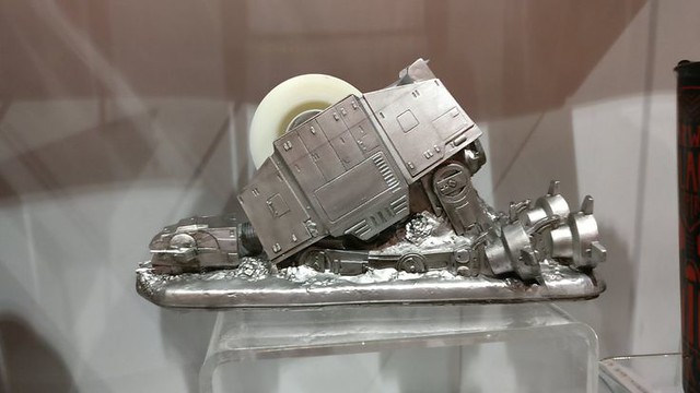 「AT-AT 膠台」長約21 公分,以電影中AT-AT 被雪地戰機繩索所絆倒的場景來打造,整體施以細緻的造型刻畫,裝甲、四足、頭部的機械構造都考究地再現,並有著厚重的金屬質感,巧妙地將AT-AT 的上半身設計成放置膠代的台座實在有趣,看起來絲毫沒有違和感阿!當然也有配備用來切斷膠帶的鋸齒狀切口,雖然本作是以單一的銀色來呈現,但也精巧地形塑出雪地的環境,兼具經典的造型和實用性,絕對值得星戰迷入手收藏!