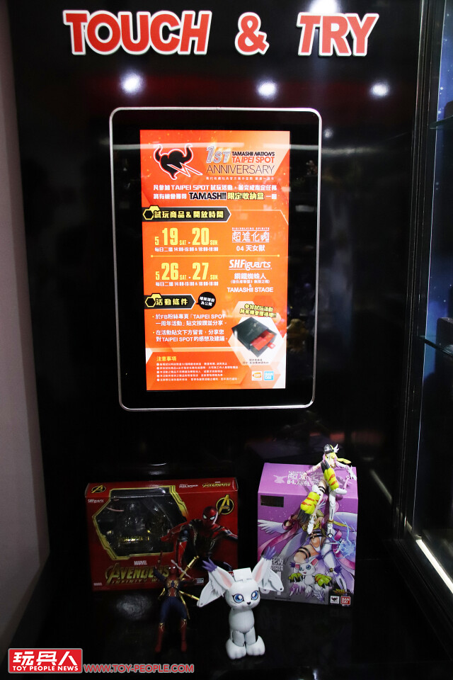 「TNTS」展示空間現場還有商品試玩區,凡於5月19日(六)、20日(日)、26日(六)、27(日)至「TAMASHII NATIONS TAIPEI SPOT」參加試玩活動,公開分享活動貼文並留言,就有機會獲得特製收納盒(尺寸約9*9*5公分)!每個試玩時段限量贈送50個。目前提供試玩的商品是「超進化魂04 天女獸」以及「S.H.Figuarts 蜘蛛人(無限之戰ver.)」。