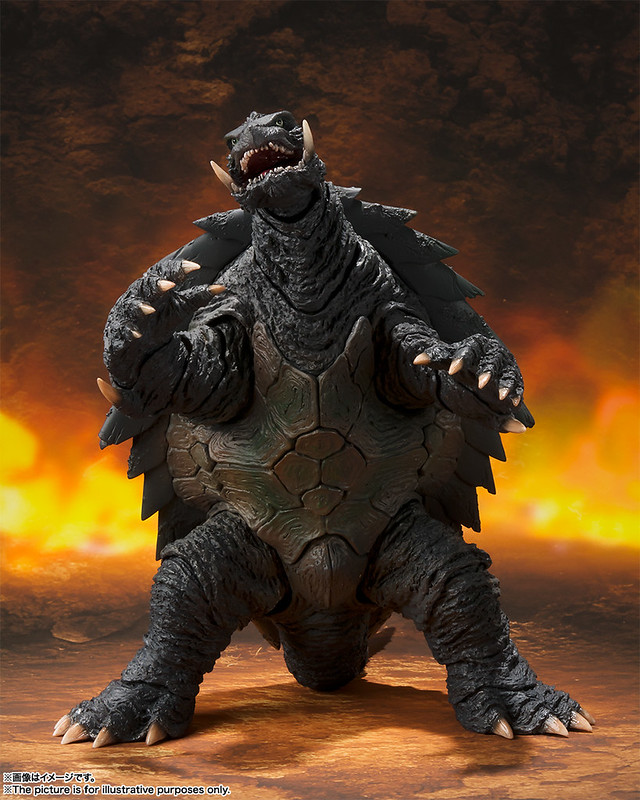 以《G3》造型登場的「S.H.MonsterArts 卡美拉(1999)」再現了龜殼銳利的鋸齒邊緣以及皮膚的粗糙質感,腹部的龜殼紋路像當細膩,也透過出色的塗裝呈現龜殼特殊的光澤及泛黃的牙齒與利爪,生物感十足。從下顎、頸部到四肢、尾巴皆設有大量可動關節,透過替換零件還能讓卡美拉變為海龜般的飛行型態,當然也有結尾吸收火焰打爆伊利斯的「火焰掌」!