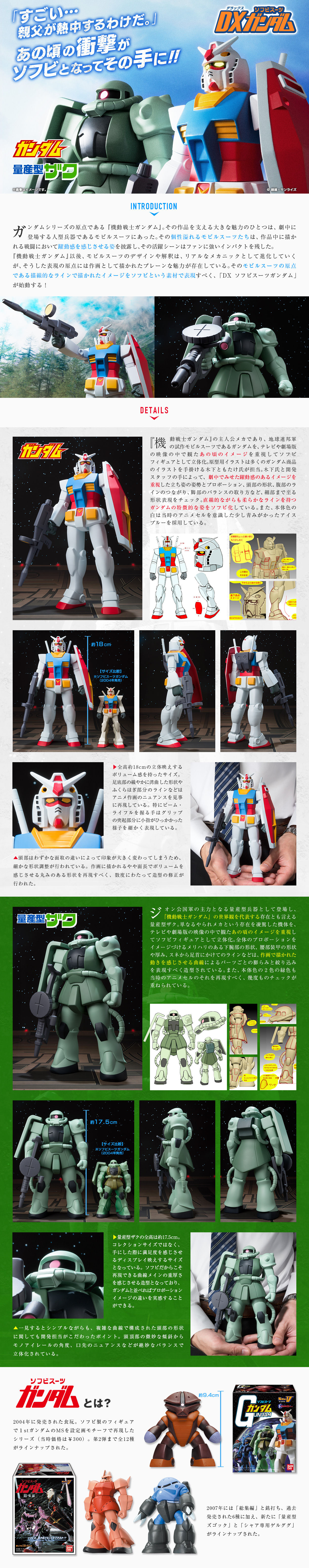 此次推出的『DX軟膠戰士鋼彈(DXソフビスーツガンダム)』是萬代於 2004 年發售的食玩商品「軟膠戰士鋼彈(ソフビスーツガンダム)」的豪華加強版,當時『軟膠戰士鋼彈』便是主打《機動戰士鋼彈》動畫初期的機體設定,將擁有特殊曲線、復古色調的機體以 10 公分左右的軟膠模型再現。而『DX軟膠戰士鋼彈』也擁有相同的主題,更將尺寸拉高至 18 公分左右!
