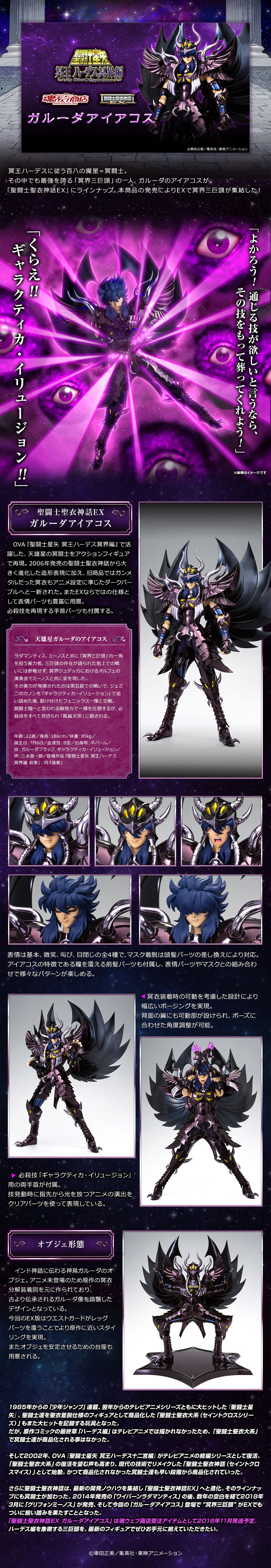 知名日廠Bandai萬代玩具公司十分受歡迎的聖鬪士聖衣神話系列,以《聖闘士星矢 冥王哈迪斯篇》為題材已經推出過冥鬥士「天猛星 拉達曼迪斯」以及「天貴星 格里芬‧米諾斯」後,官網公開將推出冥界三巨頭之一的「天雄星 神鷲艾亞哥斯(ガルーダアイアコス)」,這次終於集結故事劇中的『冥界三巨頭』了啊!
