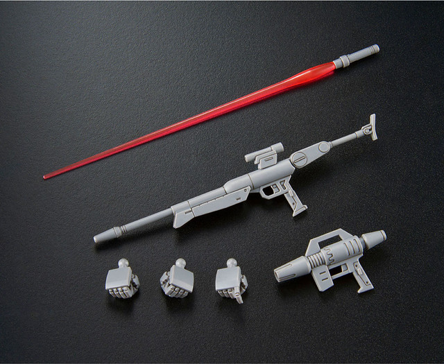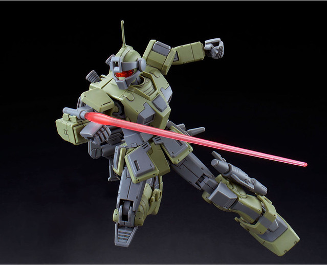 「HG 1/144 吉姆狙擊特裝型」以《機動戰士鋼彈 THE ORIGIN MSD》版本的新造型與配色為基礎製作,包含頭部、背包、腕部、腿部以及代表性的主武器「R4型光束步槍」都以新規零件製作,不但細節充實,可動性也相當出色。R4型光束步槍具備折疊機構,可收納至後裙甲。光束軍刀與光束噴槍則能分別裝備於右腕與左小腿。