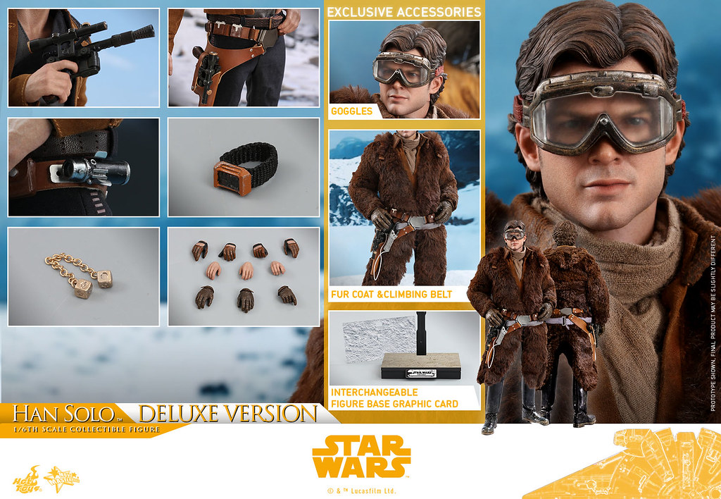 「韓·索羅 豪華版 1/6 比例人偶」除了包含普通版的所有內容之外,更附屬了對應劇情的棕色仿貂皮大衣,內裡還有仿麂皮外套和淡棕色圍巾,加上特製的雪地護目鏡讓整體更有層次感,另外還有細緻的登山專用腰帶和佩戴咖啡色手套的替換手型,地台也追加了雪地背景的替換紙卡喔~