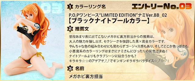 此次的「Ver.BB」三週年紀念商品將讓過去相當熱賣的「娜美 Ver.BB_02」賦予全新的限定色彩,而這樣的配色就來自於 04 月中旬 MegaHouse 所舉辦的投票企劃「キミは“ナミ”色が好きですか!?」,最終結果由黑金配色的「夜間泳池配色(ブラックナイトプールカラー)」以第一名獲選!
