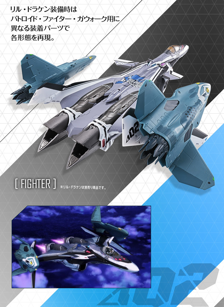 本體 、替換用手掌左右各6種、格鬥戰用短刀左右 、駕駛員人偶2種(梅薩/疾風) 、專用台座一組、利刃・魔龍連接用零件左右(Fighter/Gerwalk型態用) 、利刃・魔龍連接用零件左右(Battroid型態用)、預備用天線零件