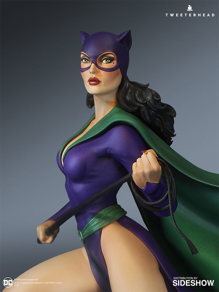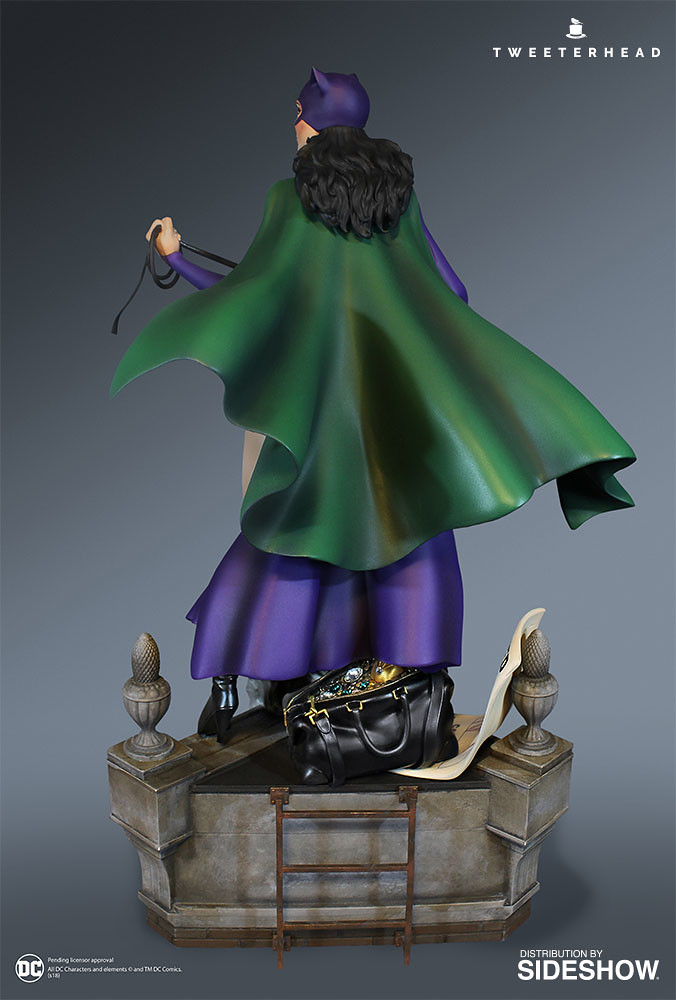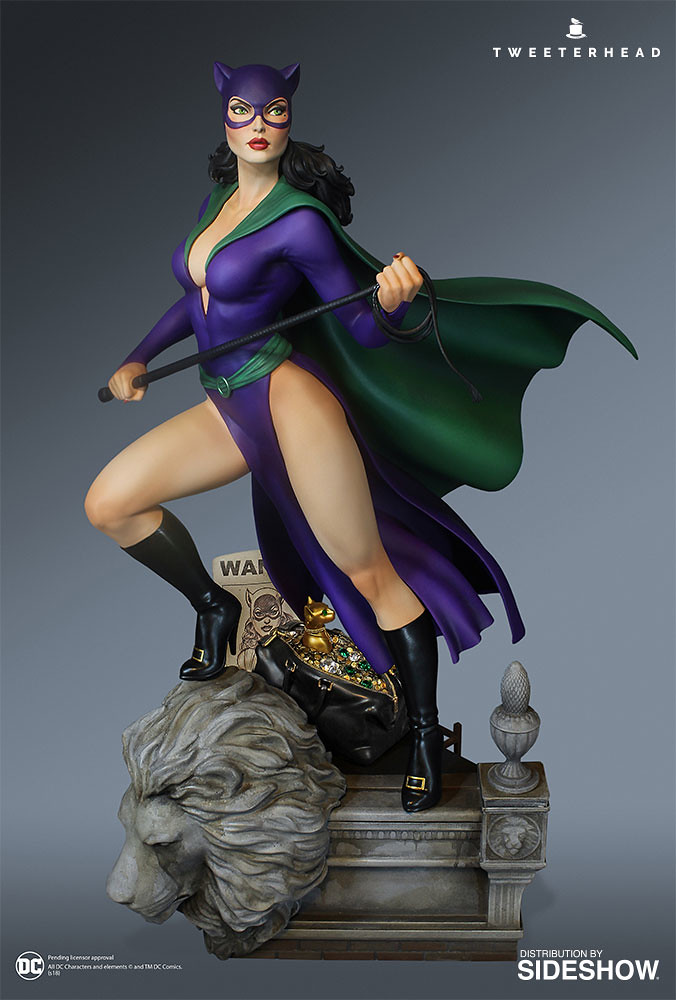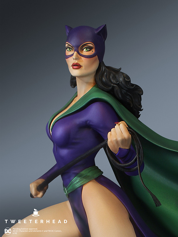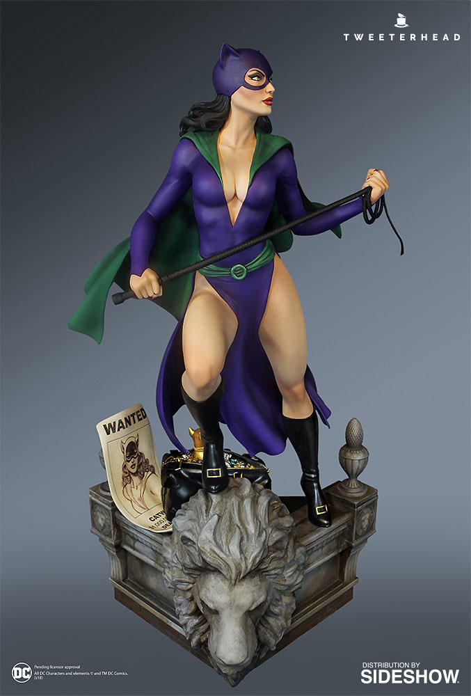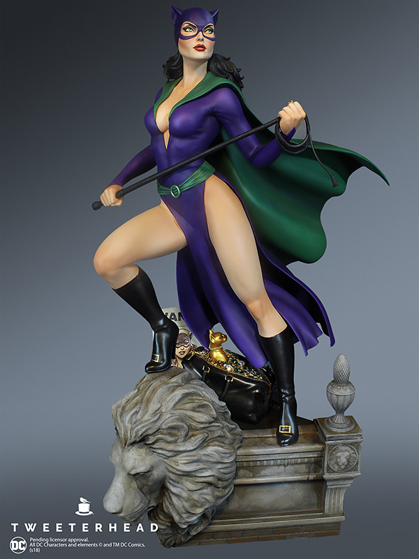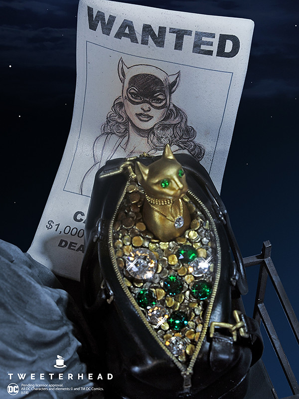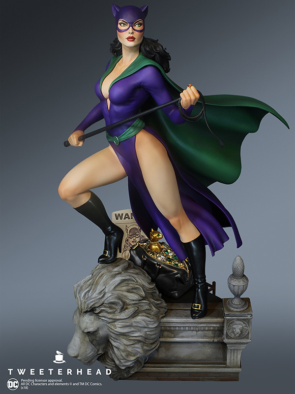 「貓女 1/6 比例全身雕像」高約40 公分,以紫色高衩洋裝搭配綠色斗篷的復古造型為主題製作,手握皮鞭,彷彿正注視著遠方的獵物,胸口極為深V 的設計凸顯她豐滿的上圍,而長腿也展現出健美的體態,飛舞的裙襬和斗蓬更增添本作的張力,除了火辣的貓女本體外,地台也相當有意思!不但有塞滿金銀財寶的提袋,還有一張貓女的懸賞單;Tweeterhead 將復古造型的貓女以精湛製作工藝重新詮釋,絕對值得粉絲珍藏啊~