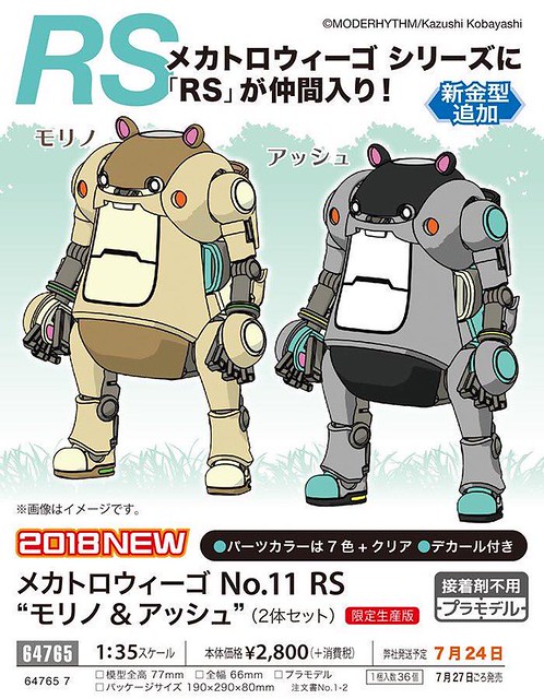 這次將以「RS」 動物造型的主題來推出「莫利諾&阿敍(モリノ&アッシュ/MORINO & ASSHU)」(名稱暫譯)兩款系列續作品。此次「RS」以新規開發出來的配件呈現,手部本來是C字夾也該改為"爪子型態"以及腳掌底部加了"肉球圖案"來配合這次的鼠型機械體,此次的包裝盒繪應該也是會交由「新井圭一」老師來繪製,自行組裝的35機動機器人行走姿勢或是坐姿都可隨自己的喜好來調整它們,推薦給喜歡小尺寸可動玩具的玩具人參考。