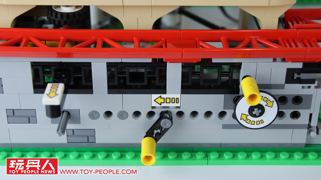 ▼在搭乘雲霄飛車的台子下方有三個機關,由左至右分別是,拉出隱藏輪胎讓車子可以停在月台的拉桿、可以讓車子滑向上坡前的轉動桿,以及轉動鍊條的操縱桿,箭頭都貼心地標出方向根本不用怕轉錯啦~