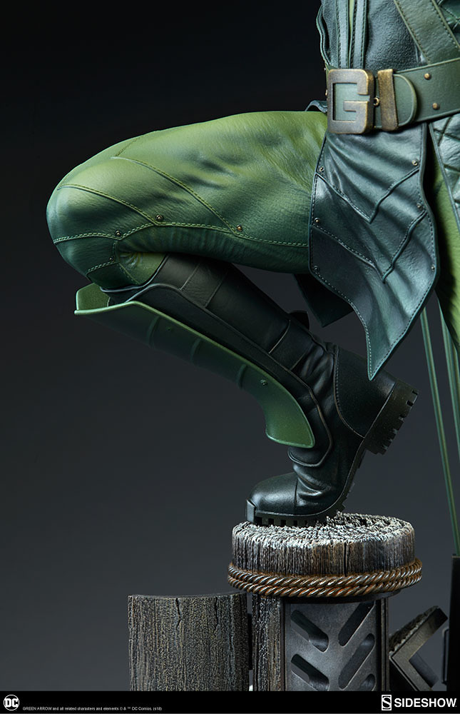 「綠箭俠 1/4 比例全身雕像」高約64.7 公分,以細緻的雕刻工藝打造出綠箭俠極具張力的拉弓姿態,雙臂肌肉線條的形塑尤其生動,根據漫畫造型所打造的緊身衣、手套、兜帽皆擁有精彩的細節,深淺不一的綠色服裝和格紋使本作富含層次,也展現出皮革的質地,除了身後背著的箭筒之外,地台也呈現出綠箭俠暗藏弓箭的機關,而在EX 版中,還追加了一款露出經典山羊鬍、戴著獵人帽的替換頭雕,以及箭尖是拳擊手套的弓箭歐~實在太帥氣啦!!