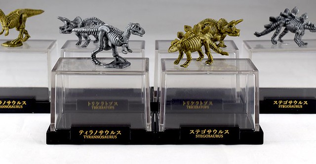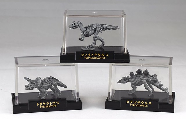 推出多款創意題材轉蛋商品的Epoch(エポック)品牌,這次將以"迷你博物館 (ミニ博物館)"為題材來推出「恐龍骨骼篇(恐竜骨格編)」的轉蛋作品,這次將收錄有"暴龍"、"三角龍"與"劍龍"等等三款不同的恐龍骨骼,每款在有"金"、"銀"兩種不同配色,此次各款也都在附有一個透明材質的展示盒,可以將恐龍骨骼放置於內或是拿出來展示等等,喜愛恐龍系列的玩具人可以參考一下歐!