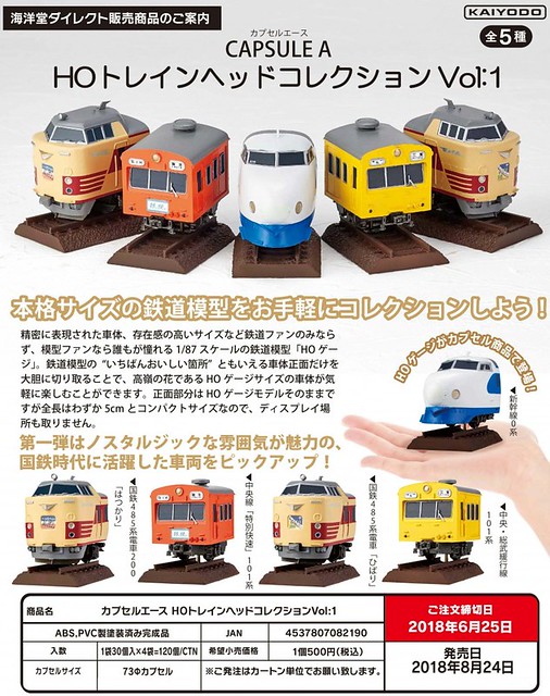 2018年8月7日新增官方清晰宣傳圖片以及販售相關資訊,鐵道模型通常是指鐵路的比例模型,經常是依照真實的尺寸並且再依比例來製作而成,火車鐵道模型的常見比例是1:87,即是指"HO軌",軌道的間距是約16.5mm,此次作品的英文"HO"就是指"HO軌(規)"的簡稱,一樣也再現鐵道迷們喜愛的正規1:87比例尺寸大小,此次將收錄約有五款不同種類的縮小火車頭作品,喜愛《鐵道系列》作品的玩具人可以參考一下歐!
