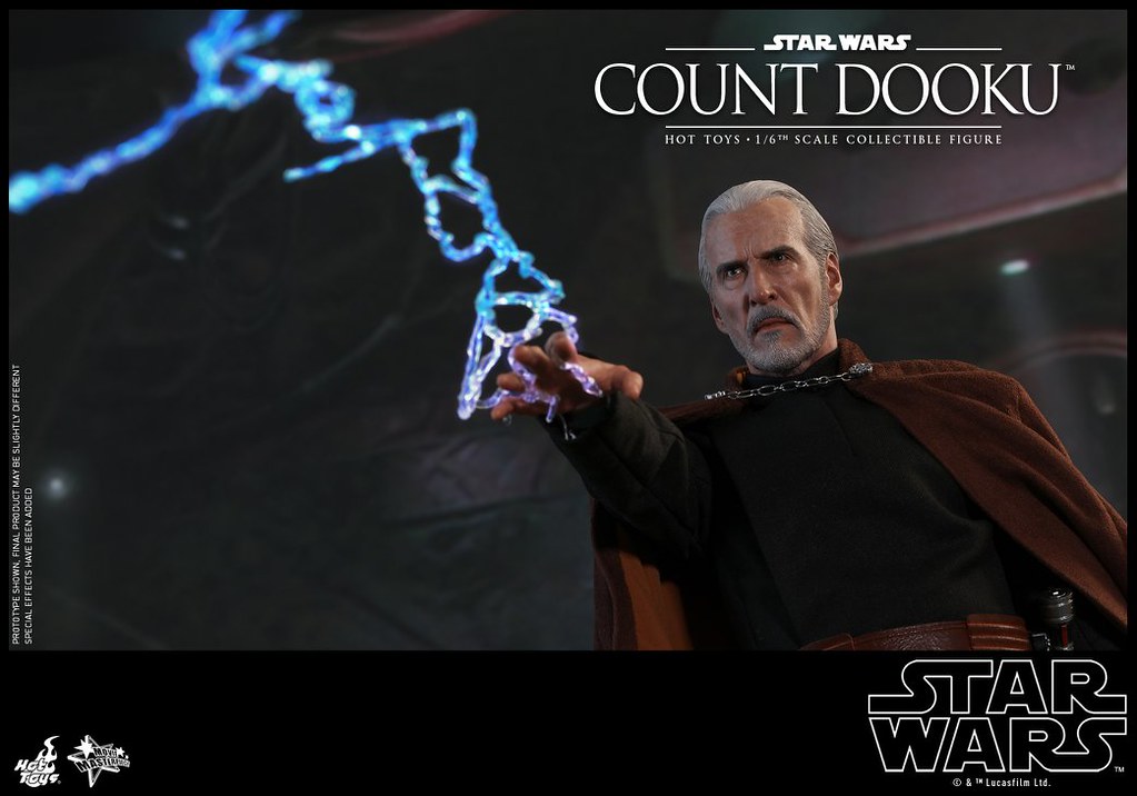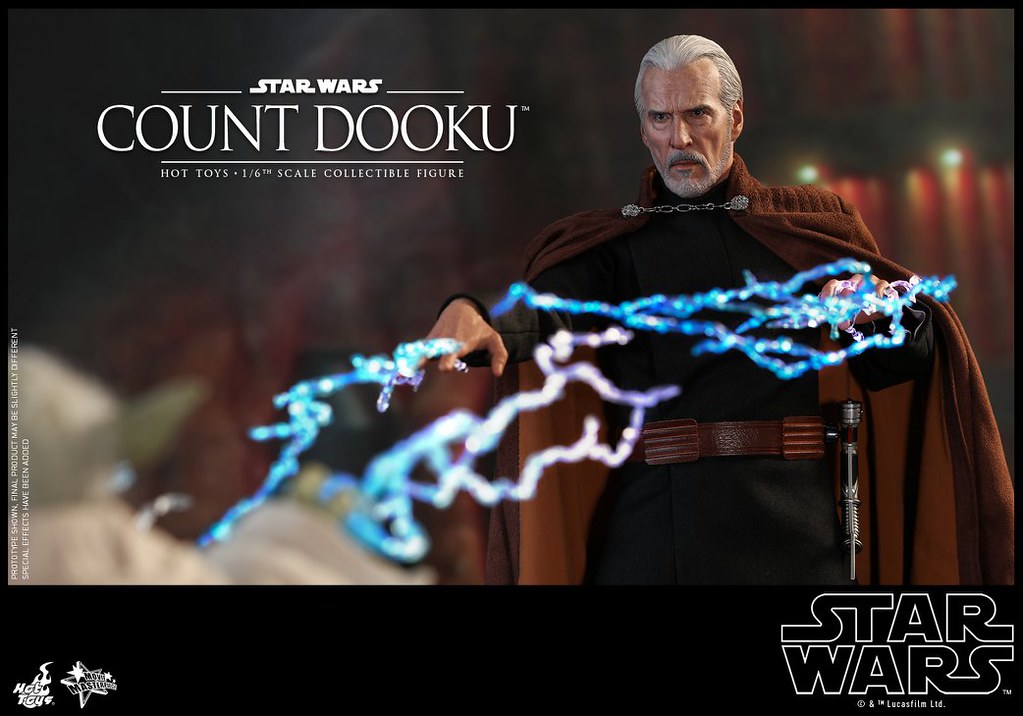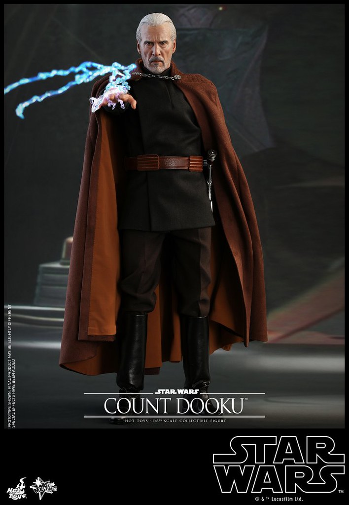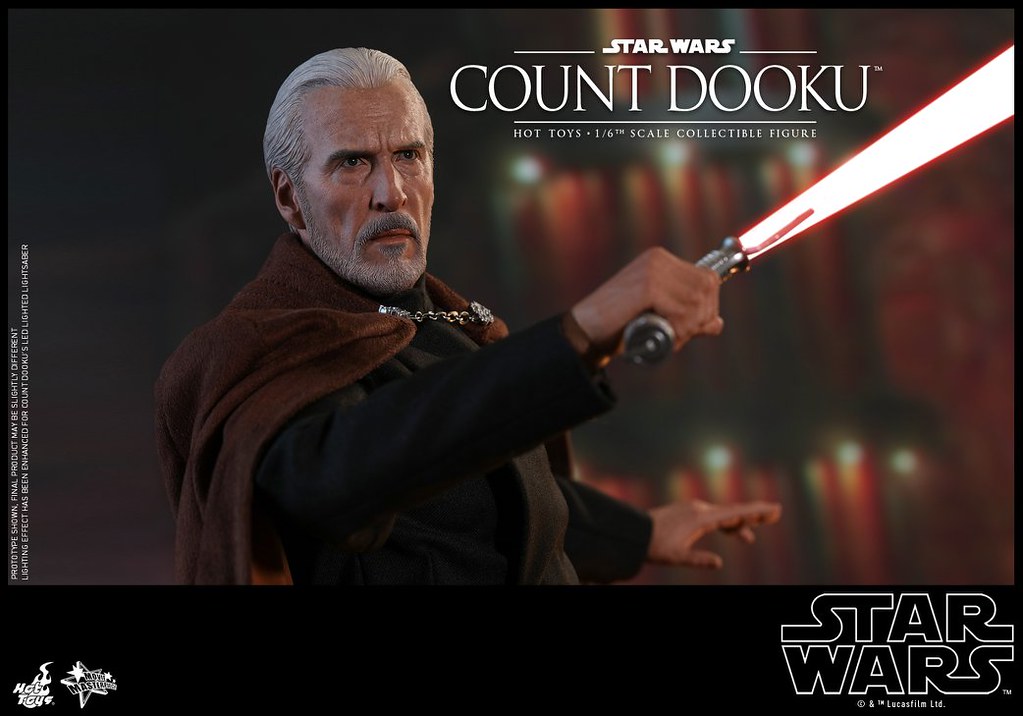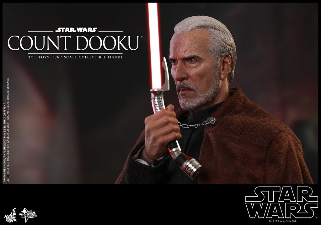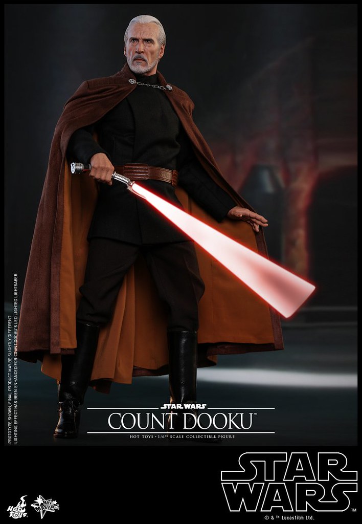 「杜庫伯爵 1/6 比例人偶」高約33 公分,全身有超過30 處可動關節,由天才頭雕師Kojun 的雕刻技術搭配E-Lee & JC. Hong 兩人精湛的上色技巧,逼真展現出演員「克里斯多福·李(Christopher Lee)」的輪廓和神韻,雙頰帶有陰影效果的塗裝、皮膚紋理、鬍子和白髮都使本作更貼近劇中形象!黑、褐搭配的服裝也考究地還原,拐杖型劍柄的光劍也具備揮舞狀態可以替換,並內置LED 發光功能,原力閃電則擁有由紫到淺藍的漂亮漸層色。