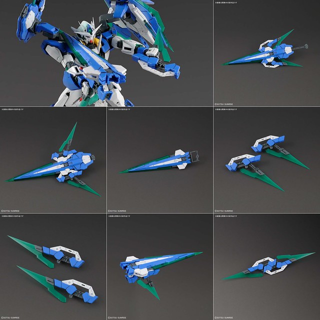 「MG 1/100 量子型00全刃式」以過去發行的「MG 量子型00」套件為基礎,首度由官方推出特徵武裝「GN劍IV全刃式」的 MG 套件,而背部連結 GN 劍 IV、GN 盾牌的裝甲也以新規零件製作。此外,這次的頭部天線是採用海老川兼武繪製的視覺圖造型,向上的兩根天線造型更近似於 00 鋼彈。商品中也附上了「GN劍IV全刃式」使用的標誌貼紙與專用支架。