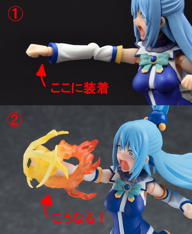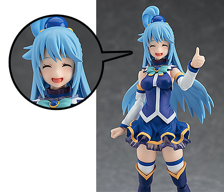 「figma 阿克婭」以動畫版的人物設定為基礎製作,從髮型、裙襬皺摺與薄紗、到各種欠打的表情全都忠實再現,並且透過 figma 獨創關節零件打造高度可動性。表情零件包含了啊啦~看上去不是很正常的美麗女神嗎?的「笑臉」、惹麻煩後就哭著求人幫助的「哭哭臉」、岔氣流淚嘲笑你的欠打「嘲諷臉」等三種動畫版經典表情。